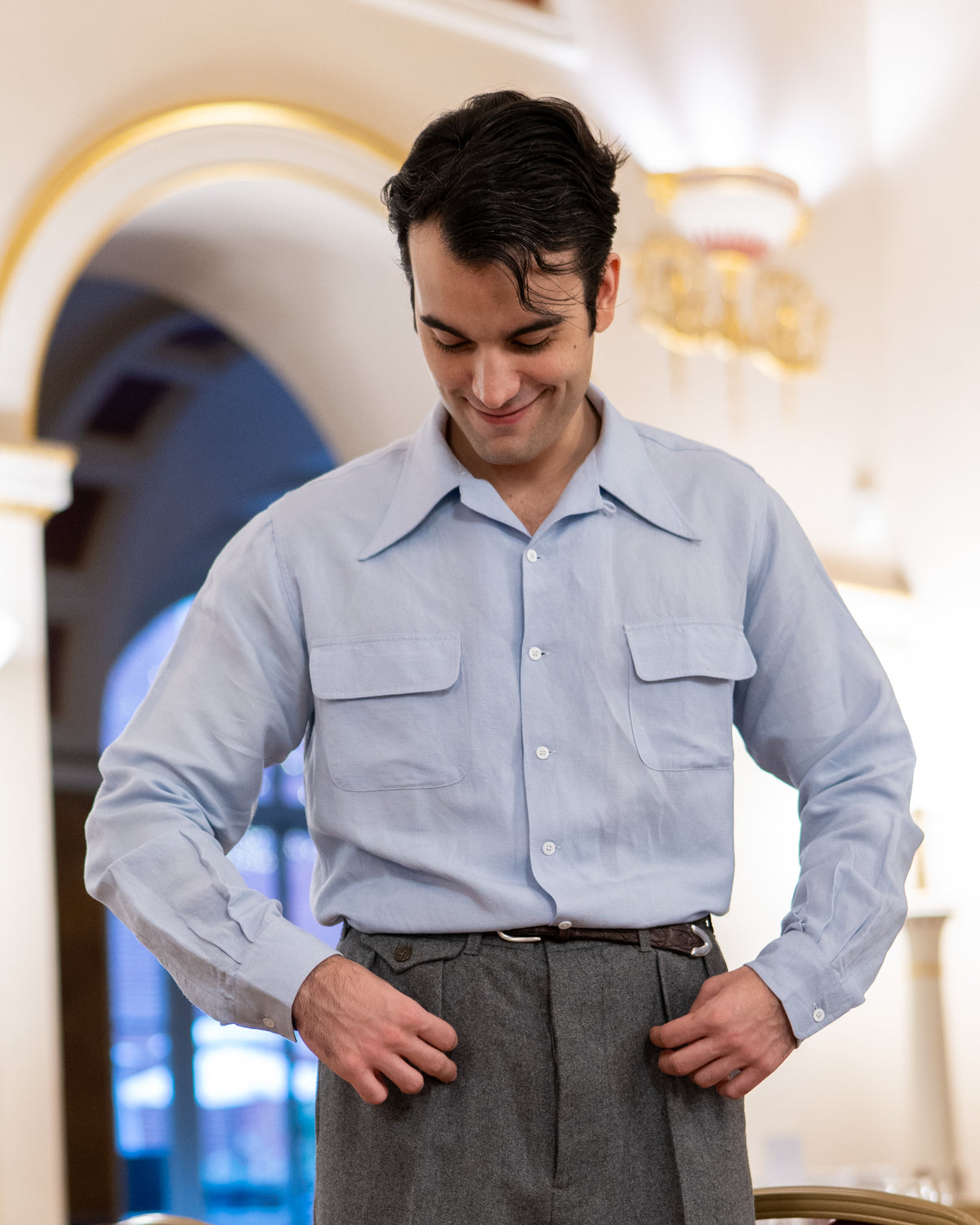 The Camp Shirt can be both long or short sleeved, can have an array of pockets – both open or flapped - however one feature is essential: the shirt must cut loose, allowing for freedom of movement and for the air to circulate around the body, and would be expected to have a straight hem, allowing the shirt to be worn untucked.