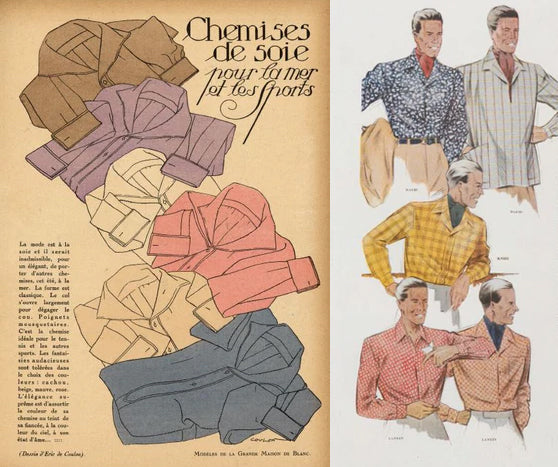 In 1930s France, arguably the world capital of stylish men’s leisure shirts at that time, open collar shirts were available in a wide-range of styles - long-sleeved, short-sleeved, single or double breasted – and were widely photographed in the fashionable Mediterranean resorts. Although often seen worn tucked in, straight hems were also seen, making the shirts almost indistinguishable from the styles seen in later decades. Indeed, there were shirt and short combinations that were little different from the ‘cabana sets’ of the 1950s and 1960s and four-pocket shirts that shared many features with the Cuban ‘guayabera’. In the post-war period French casual shirts continued to be popular, with floral patterned shirts that echoed Hawaiian shirts.