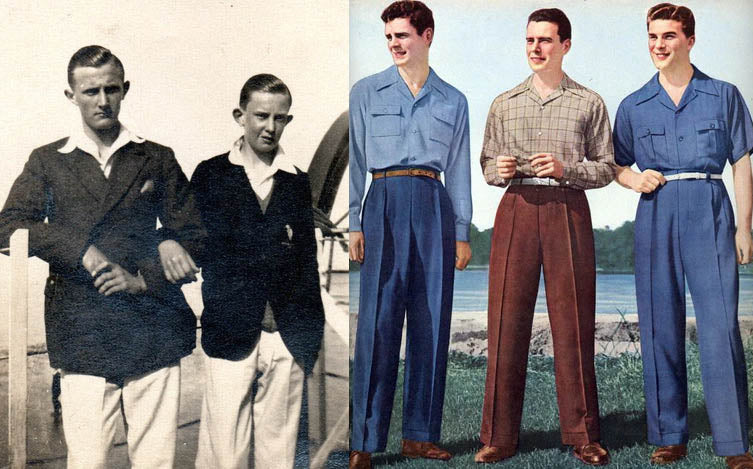 Despite being aimed at those taking part in sports, soft collared open-neck shirts became the favoured shirts of British men on holiday. Photos from the period show men with their shirts collars spread over their jacket collar, often unbuttoned to reveal an expanse of chest.