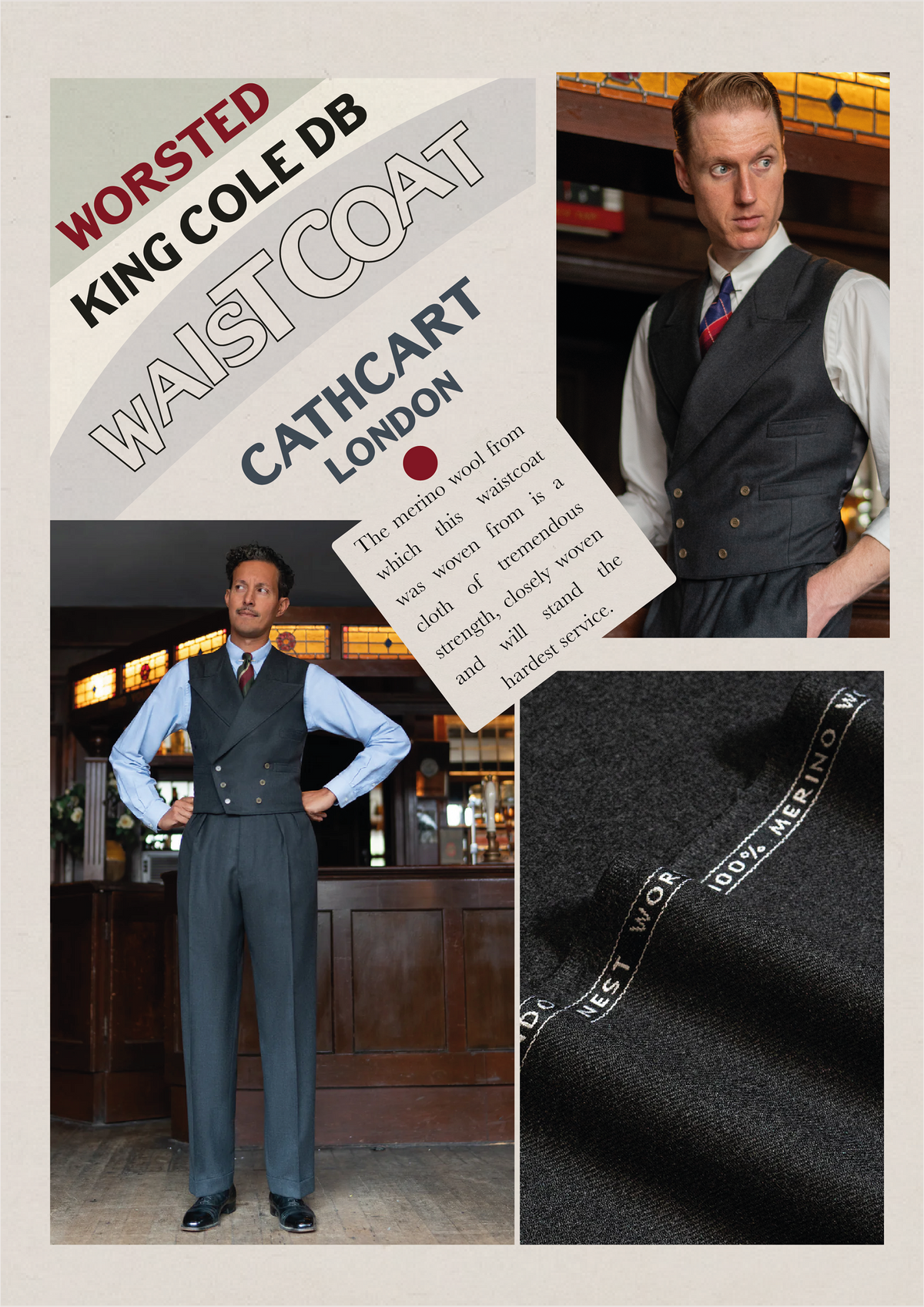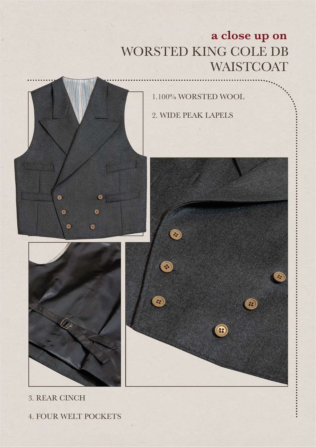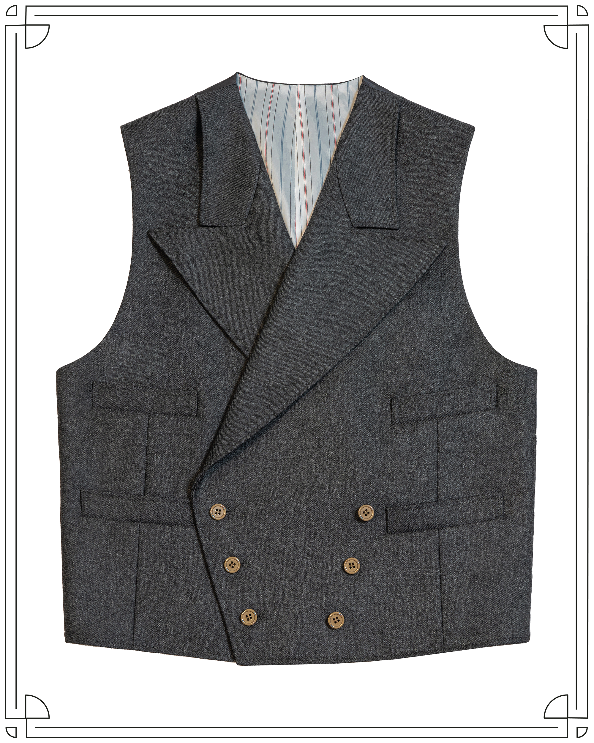 The icing on the cake of the new Shepperton Suit. Our new 1930s style double breasted waistcoat returns in pure worsted merino wool flannel. With widened peak lapels, it features a rear cinch for adjustability and four welt front pockets.