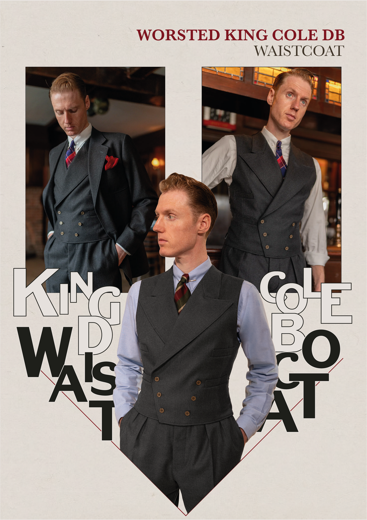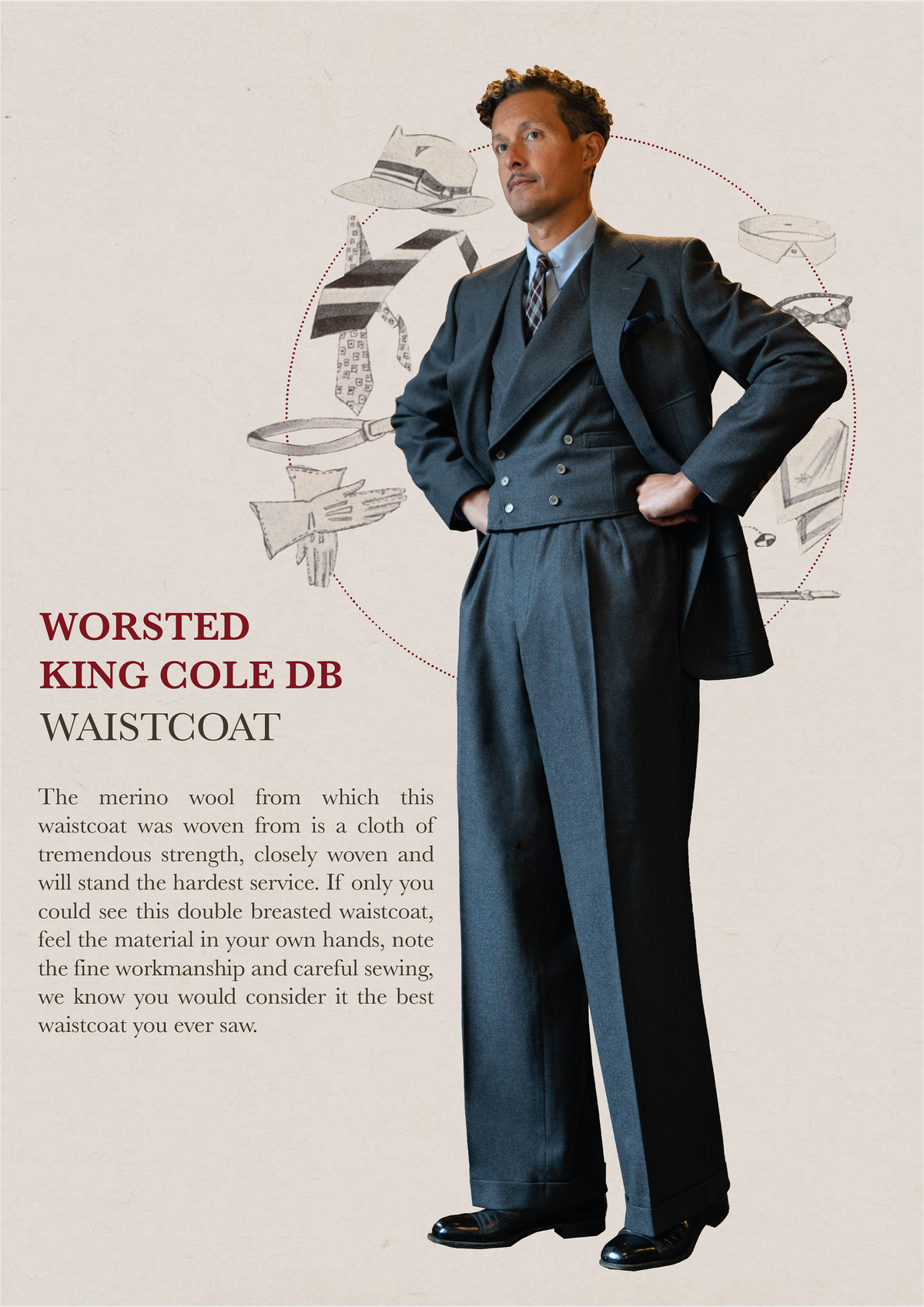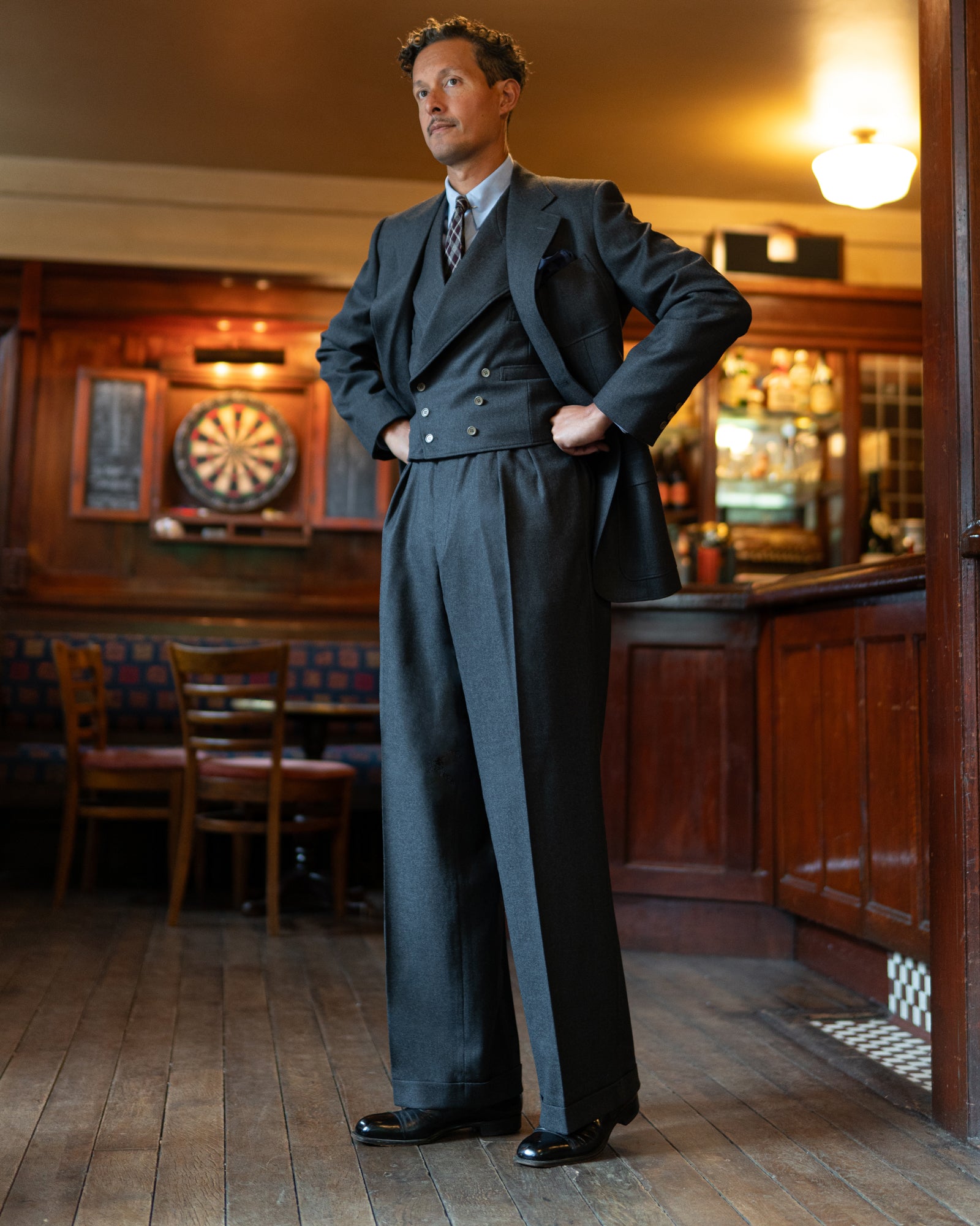The icing on the cake of the new Shepperton Suit. Our new 1930s style double breasted waistcoat returns in pure worsted merino wool flannel. With widened peak lapels, it features a rear cinch for adjustability and four welt front pockets.
