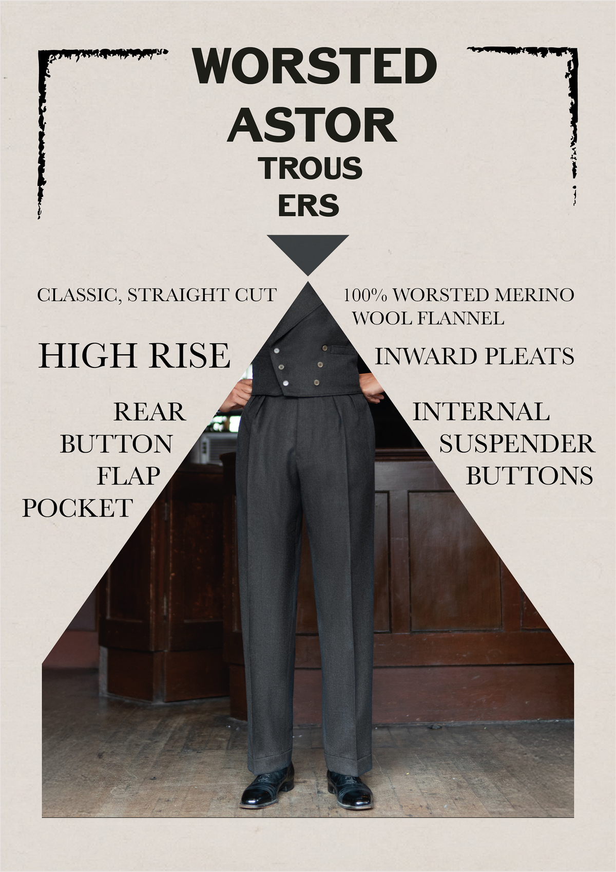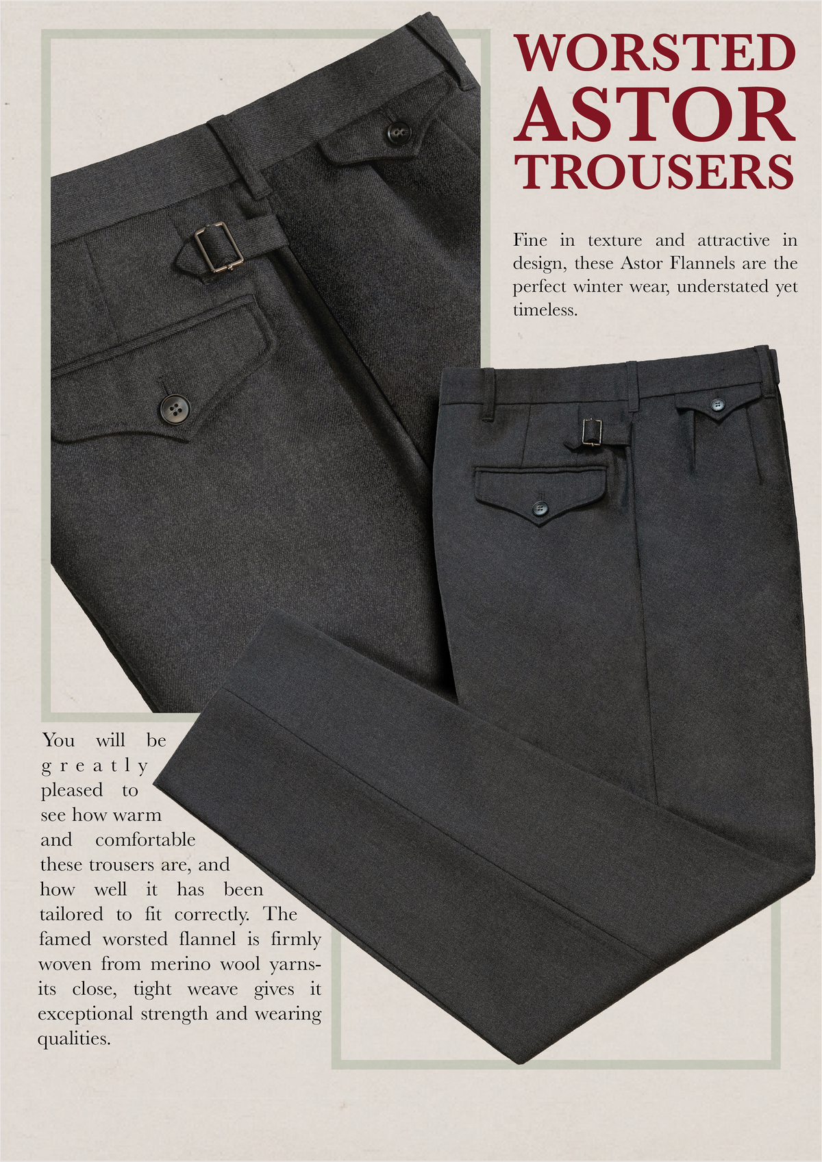 Fine in texture and attractive in design, these Astor Flannels are the perfect winter wear, understated yet timeless. You will be greatly pleased to see how warm and comfortable these trousers are, and how well it has been tailored to fit correctly. The famed worsted flannel is firmly woven from merino wool yarns- its close, tight weave gives it exceptional strength and wearing qualities.