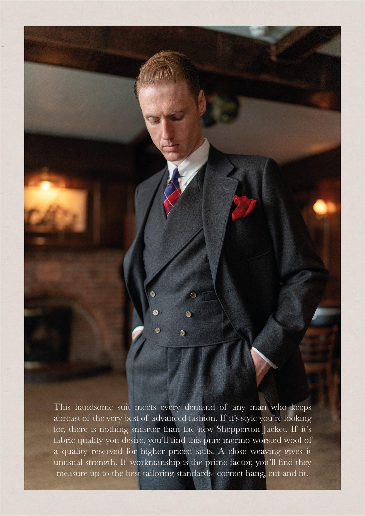 This handsome suit meets every demand of any man who keeps abreast of the very best of advanced fashion. If it’s style you’re looking for, there is nothing smarter than the new Shepperton Jacket in Grey. If it’s fabric quality you desire, you’ll find this pure merino worsted wool of a quality reserved for higher priced suits. A close weaving gives it unusual strength. If workmanship is the prime factor, you’ll find they measure up to the best tailoring standards- correct hang, cut and fit.