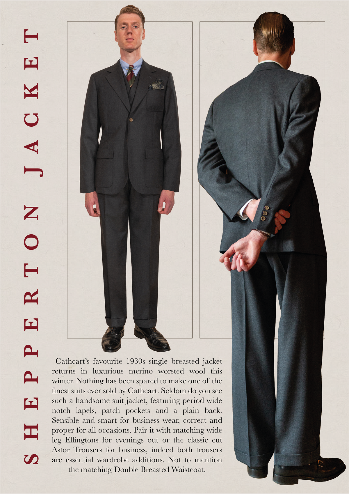 Cathcart’s favourite 1930s single breasted jacket returns in luxurious merino worsted wool this winter. Nothing has been spared to make one of the finest suits ever sold by Cathcart. Seldom do you see such a handsome suit jacket, featuring period wide notch lapels, patch pockets and a plain back. Consider it the perfect lounge suit, sensible and smart for business wear, correct and proper for all occasions. Pair it with matching wide leg Ellingtons for evenings out or the classic cut Astor Trousers for business, indeed both trousers are essential wardrobe additions. Not to mention the matching Double Breasted Waistcoat.