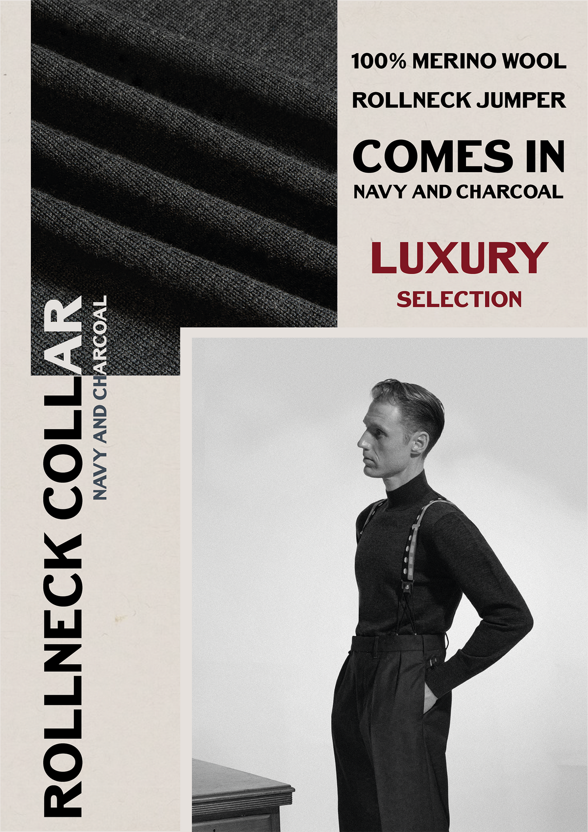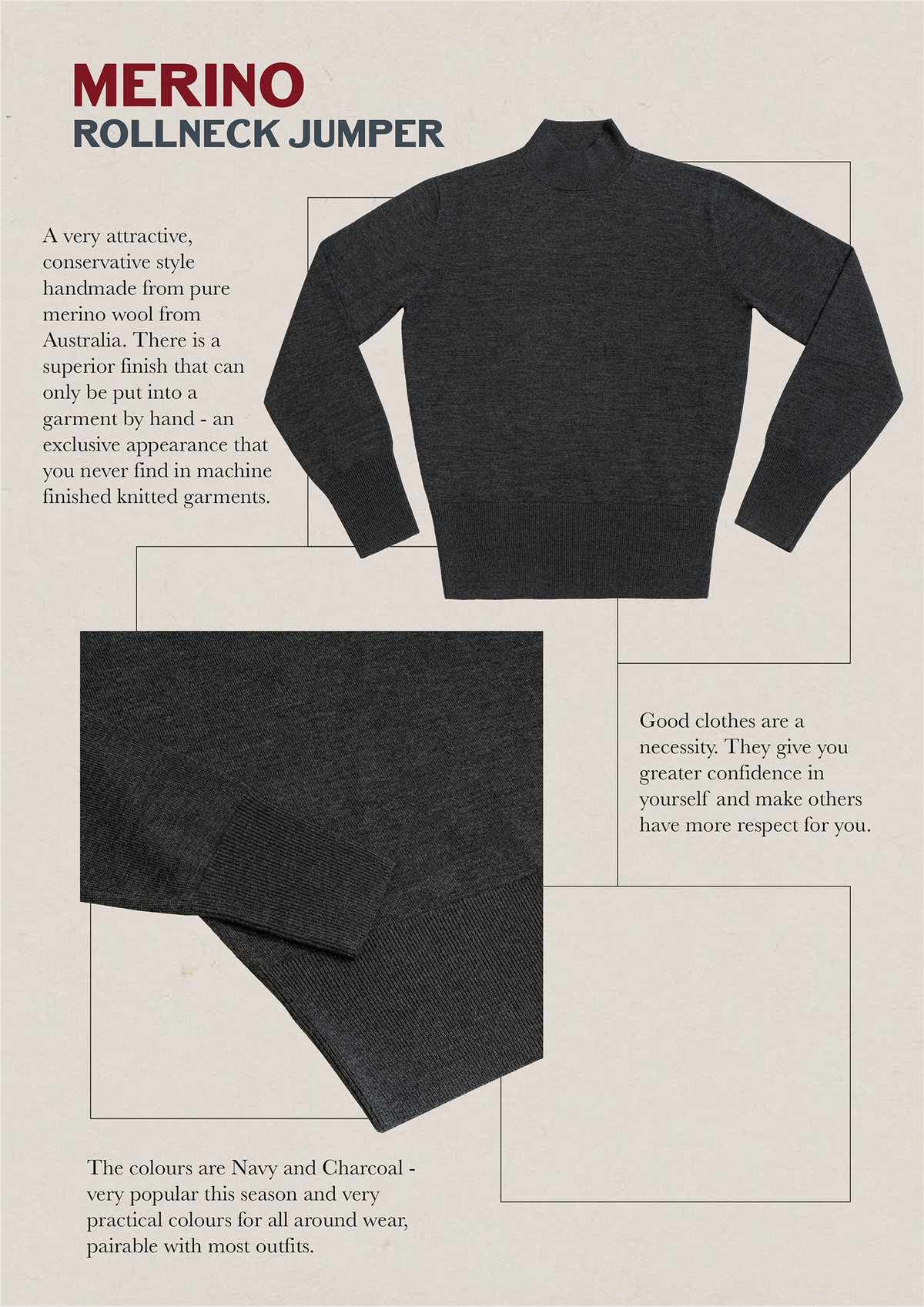 Good clothes are a necessity. They give you greater confidence in yourself and make others have more respect for you. Fine in texture and attractive in design, this merino rollneck is the perfect winter wear, understated yet timeless. You will be greatly pleased to see how warm and comfortable this rollneck feels, and how well it has been tailored to fit correctly. The colours are Navy and Charcoal - very popular this season and very practical colours for all around wear, pairable with most outfits. A much sought after essential of modern menswear, blending classic design with effortless wearability.