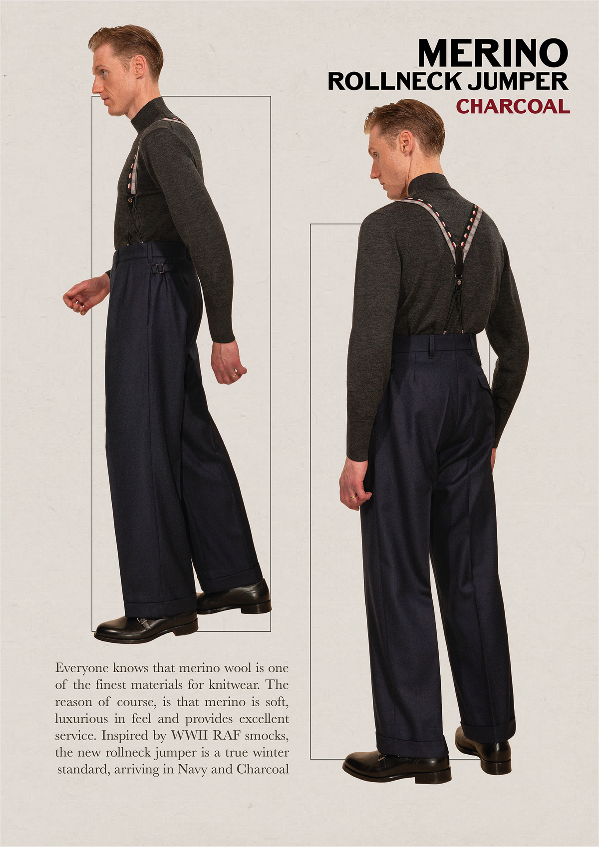 Everyone knows that merino wool is one of the finest materials for knitwear. The reason of course, is that merino is soft, luxurious in feel and provides excellent service. Inspired by WWII RAF smocks, the new Rollneck Jumper is a true winter standard. A very attractive, conservative style handmade from pure merino wool from Australia. There is a superior finish that can only be put into a garment by hand - an exclusive appearance that you never find in machine finished knitted garments. This elegant jumper is highly versatile as it can be worn under workwear, or replace a shirt and tie under a suit jacket as first made famous by Stan Laurel.
