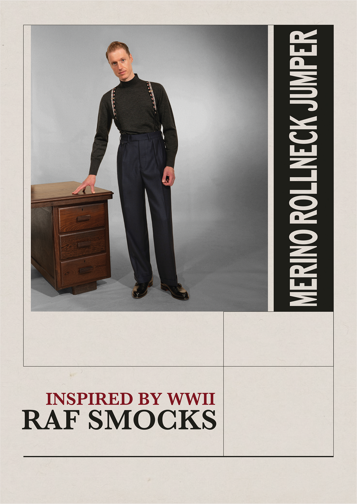 Inspired by WWII RAF smocks, the new Rollneck Jumper is a true winter standard. A very attractive, conservative style handmade from pure merino wool from Australia. Shipping now.