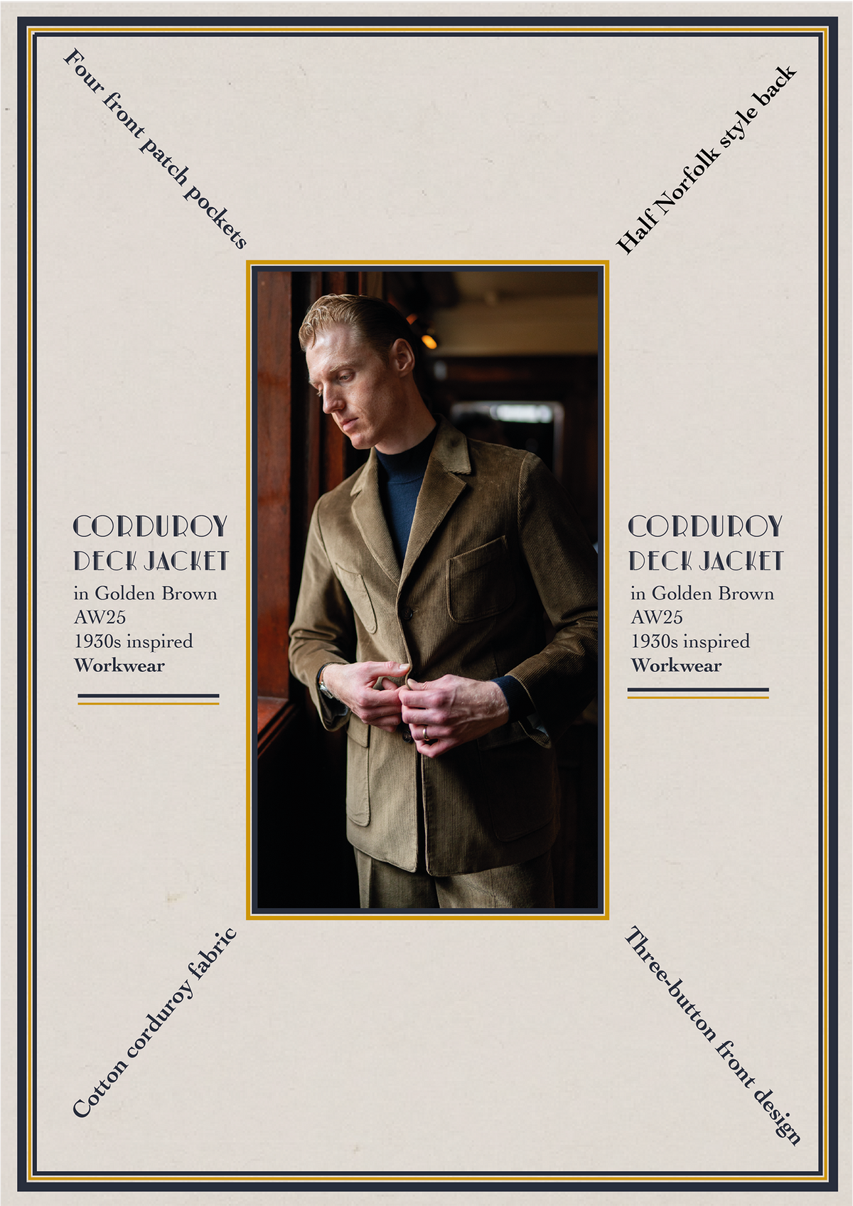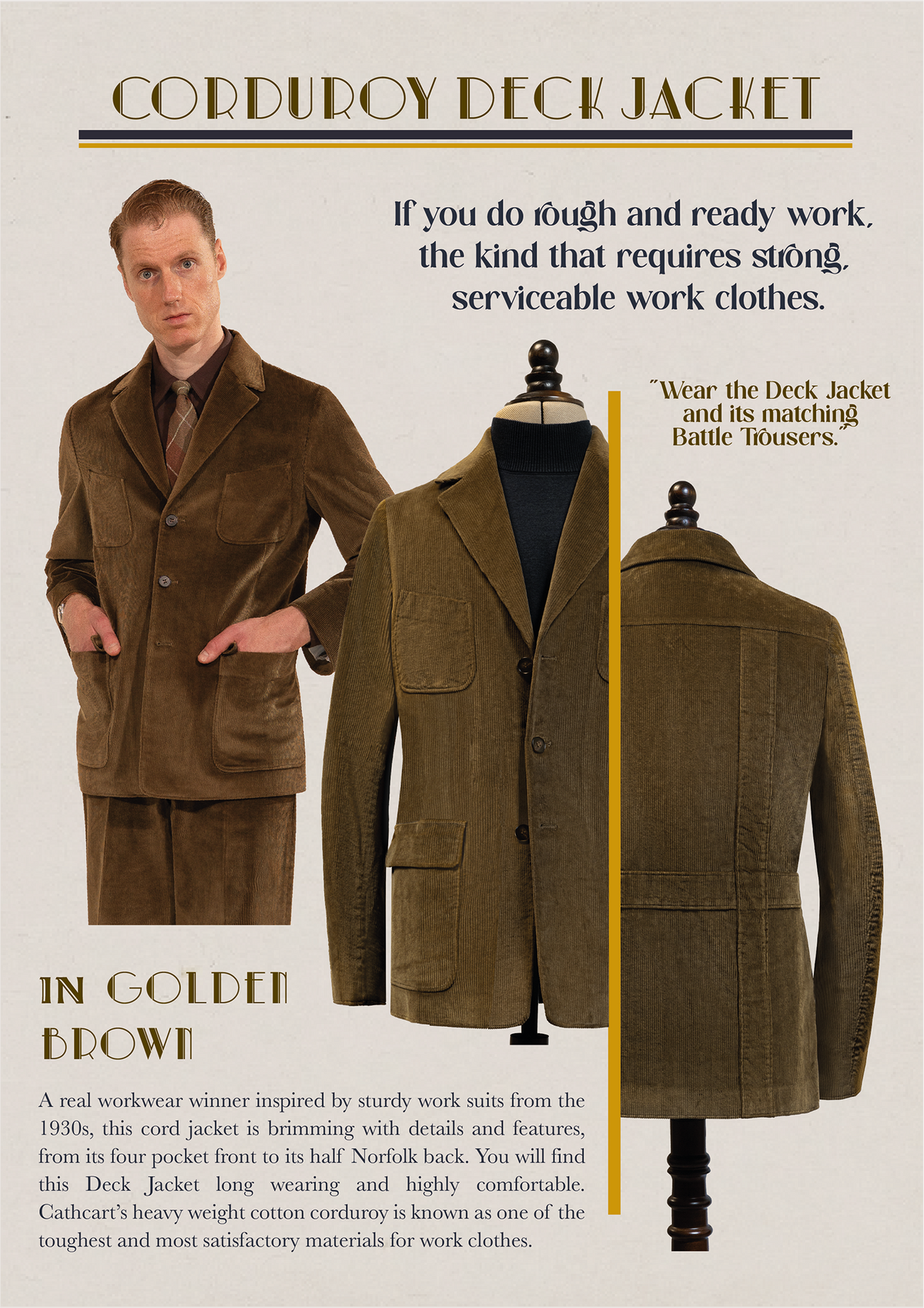 An elegantly simple half Norfolk, four pocket corduroy jacket based on an American 1930's classic that shines both in the work place and on the weekends. Wear this Deck Jacket and its matching Battle Trousers. Shipping now.