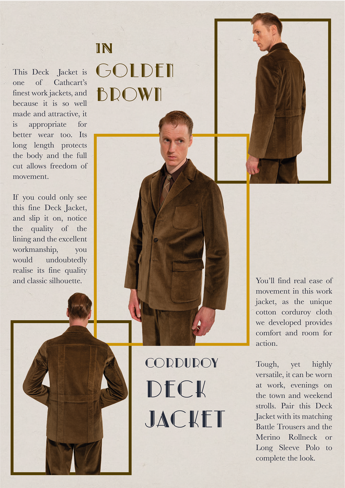 This Deck Jacket is one of Cathcart’s finest work jackets, and because it is so well made and attractive, it is appropriate for better wear too. Its long length protects the body and the full cut allows freedom of movement. If you could only see this fine jacket, and slip it on, notice the quality of the lining and the good workmanship, you would undoubtedly realise its fine quality and classic silhouette. You’ll find real ease of movement in this work jacket, as the unique cotton corduroy cloth we developed provides comfort and room for action. Tough, yet highly versatile, it can be worn at work, evenings on the town and weekend strolls. Pair this Deck Jacket with its matching battle trousers and the Merino Rollneck to complete the look.