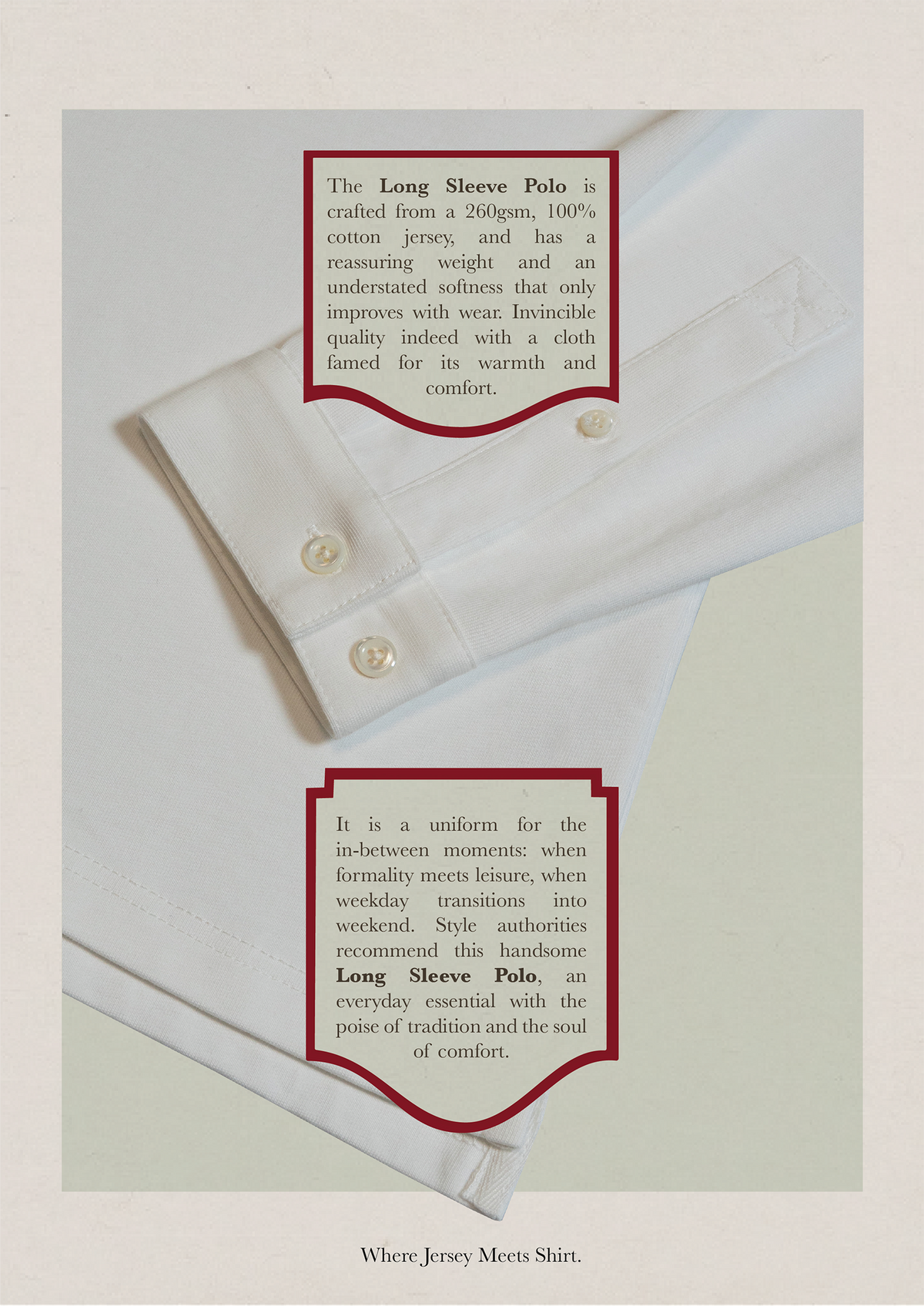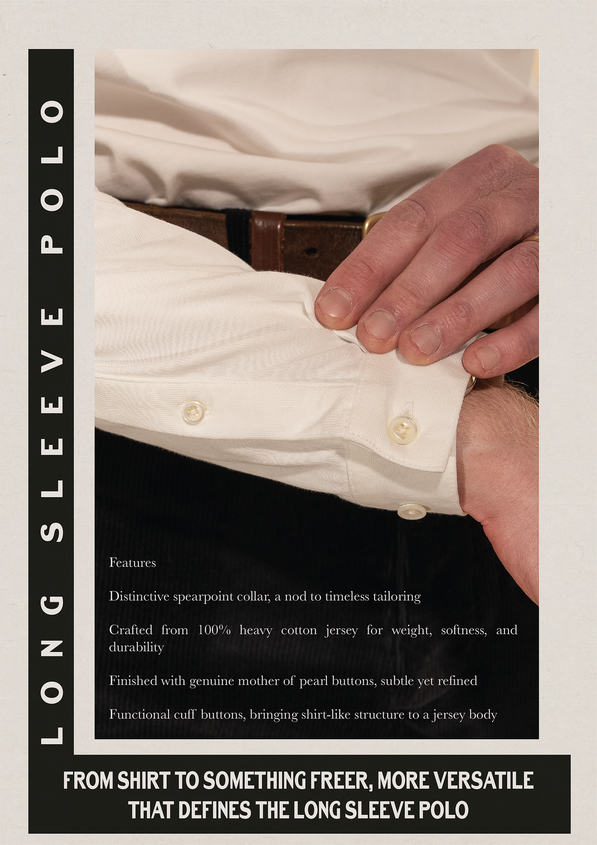 The Long Sleeve Polo is crafted from a 260gsm, 100% cotton jersey, and has a reassuring weight and an understated softness that only improves with wear. Invincible quality indeed with a cloth famed for its warmth and comfort. Style authorities recommend this handsome Long Sleeve Polo, an everyday essential with the poise of tradition and the soul of comfort. Not to be compared with inferior shirts, it is guaranteed to satisfy.
