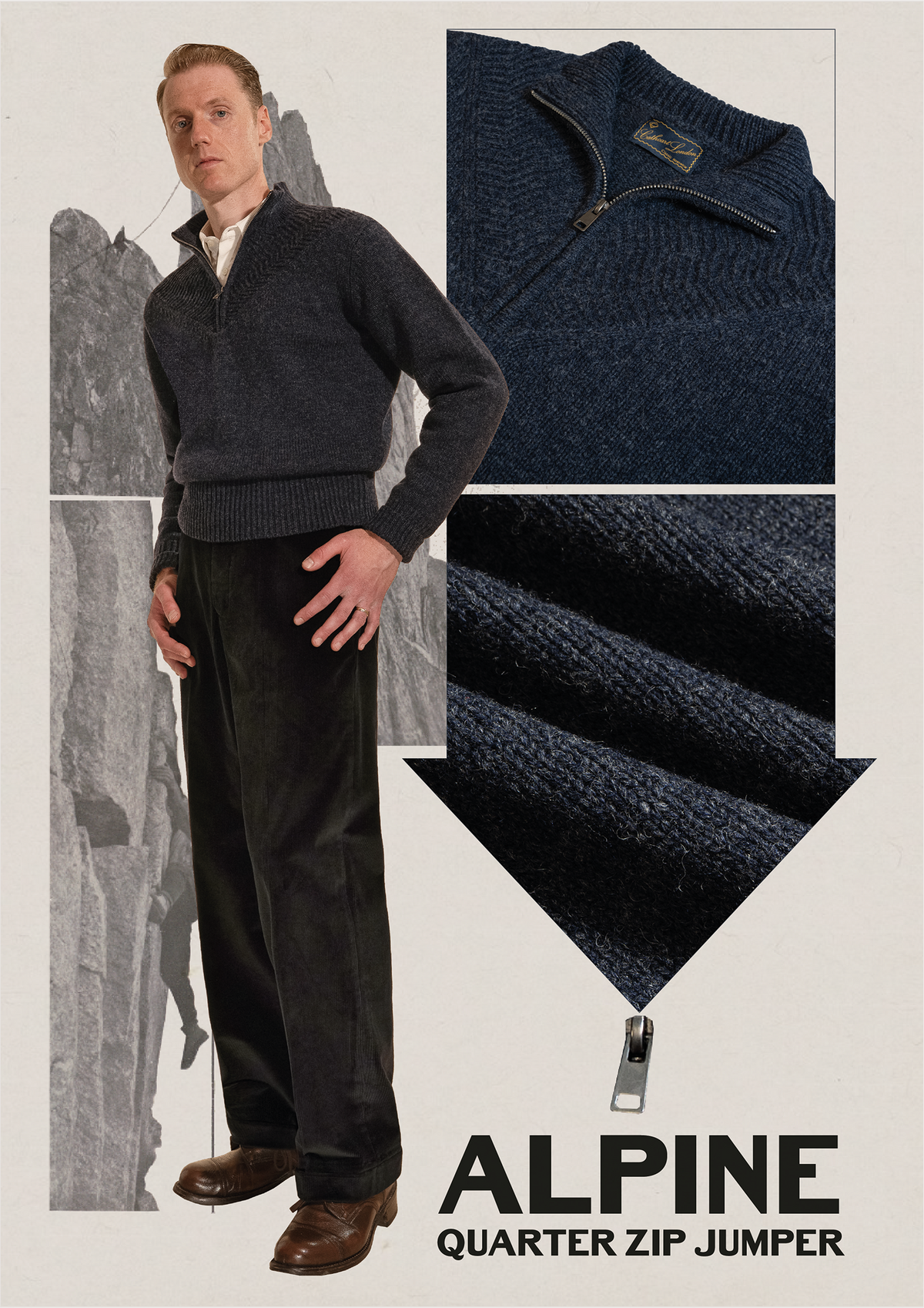 Skiing down alpine slopes in classic style calls for a period, chic quarter zip jumper with the right details. The Alpine Quarter Zip Jumper is the instant choice for men who prefer classic, quality knitwear, made entirely of heavy Shetland yarns. Inspired by knitwear of the 1930s, this pullover pairs effortlessly with workwear and tailoring alike, adding a touch of refinement to any look. Ideal for those cold winter days, it easily zips up the neck providing warmth and elegance. You pick a winner when you choose this model, both for style and warmth.