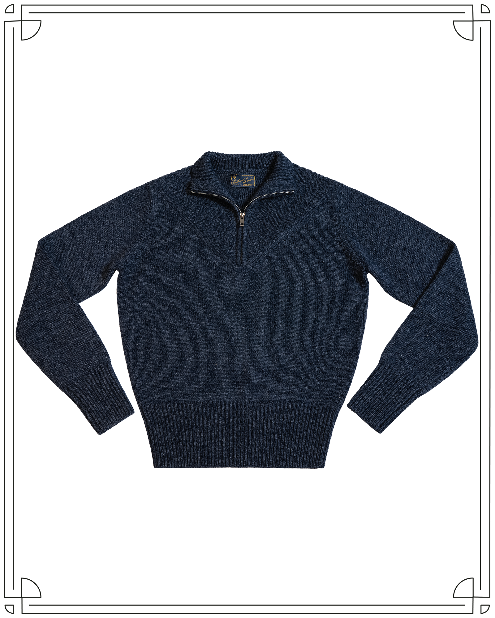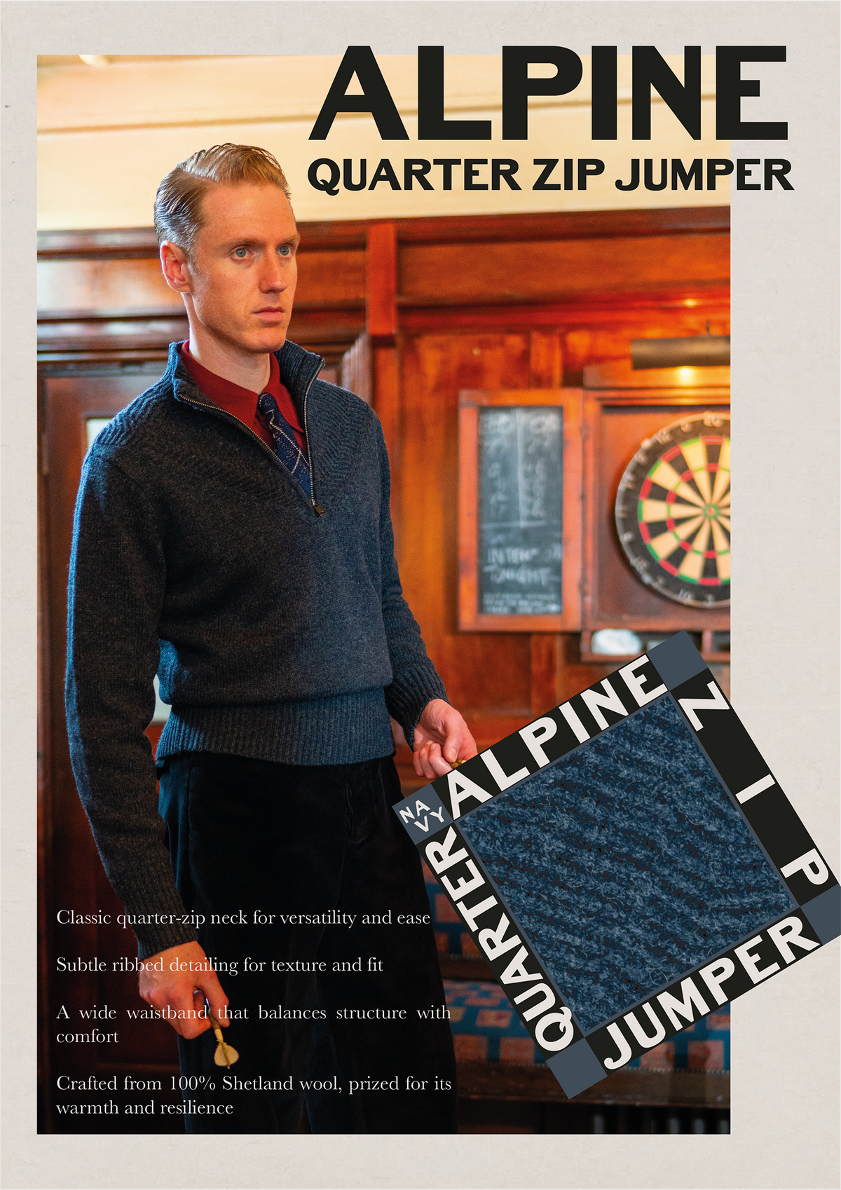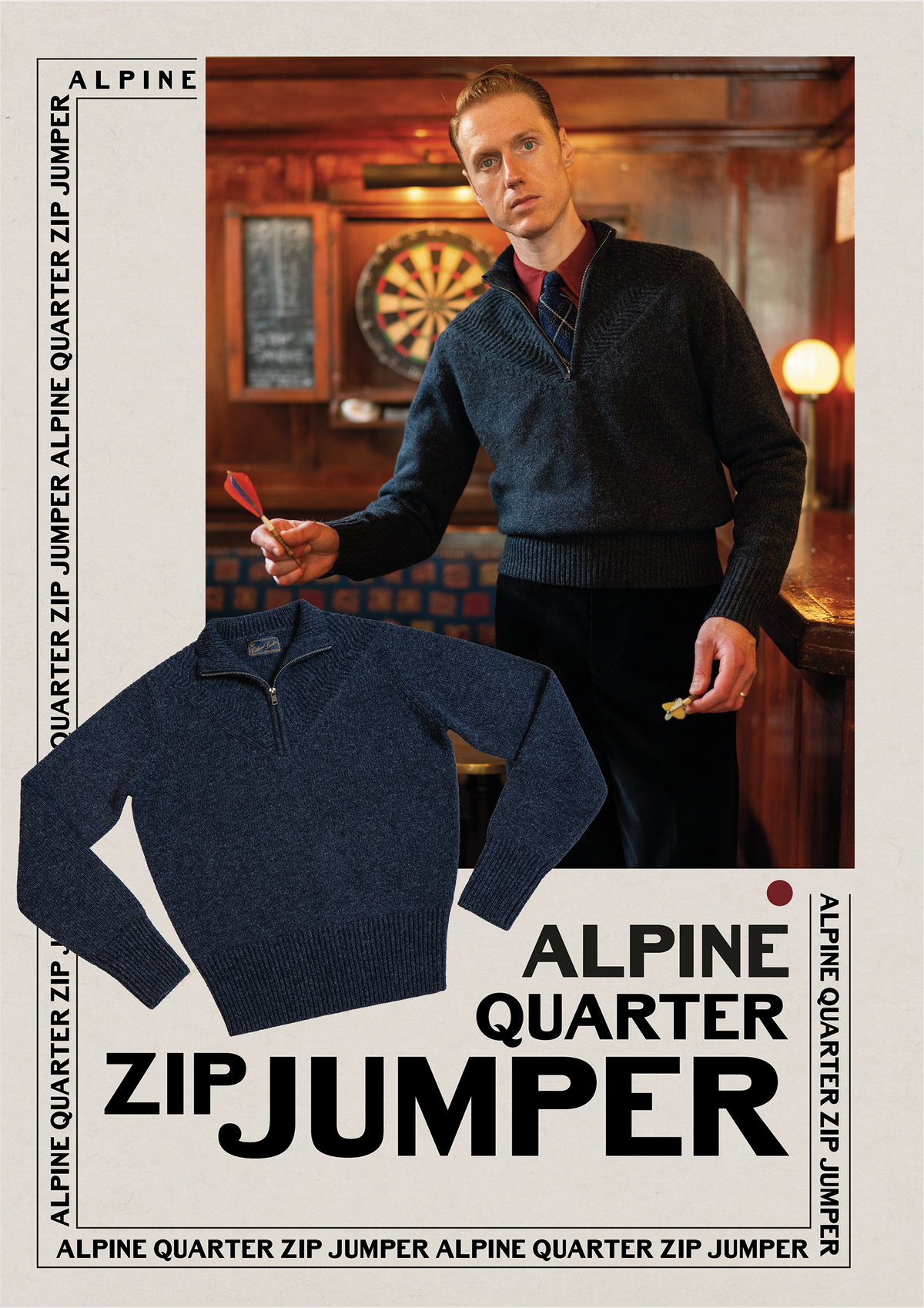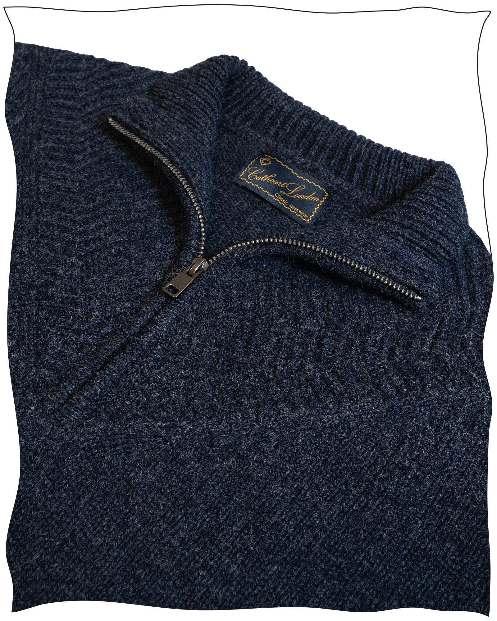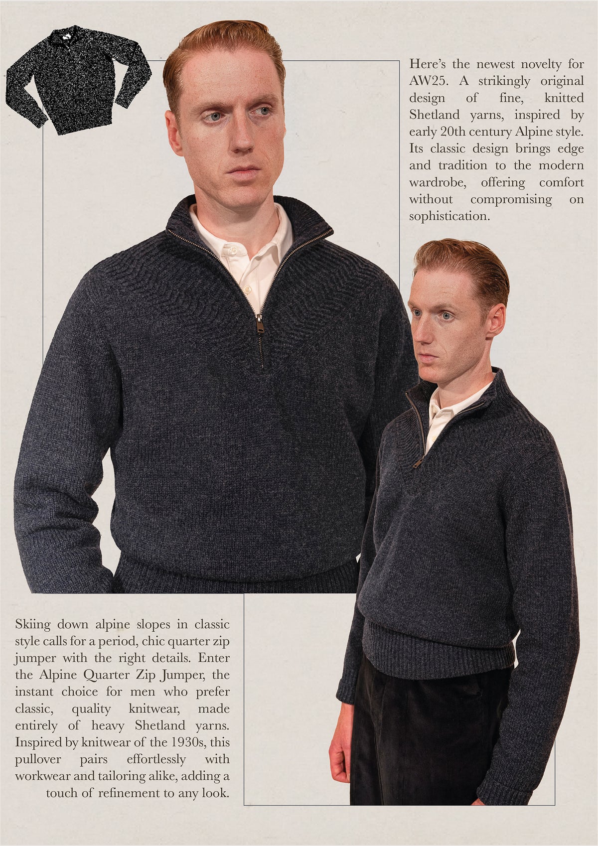 Here’s the latest novelty for AW25. A strikingly original design of fine, knitted Shetland yarns, inspired by early 20th century Alpine style. Durable yet refined, it is a piece made to endure seasons and trends alike. Because of the hand finishing of this Quarter Zip, it will fit much better than the average jumper. Suitable for sport or general wear.