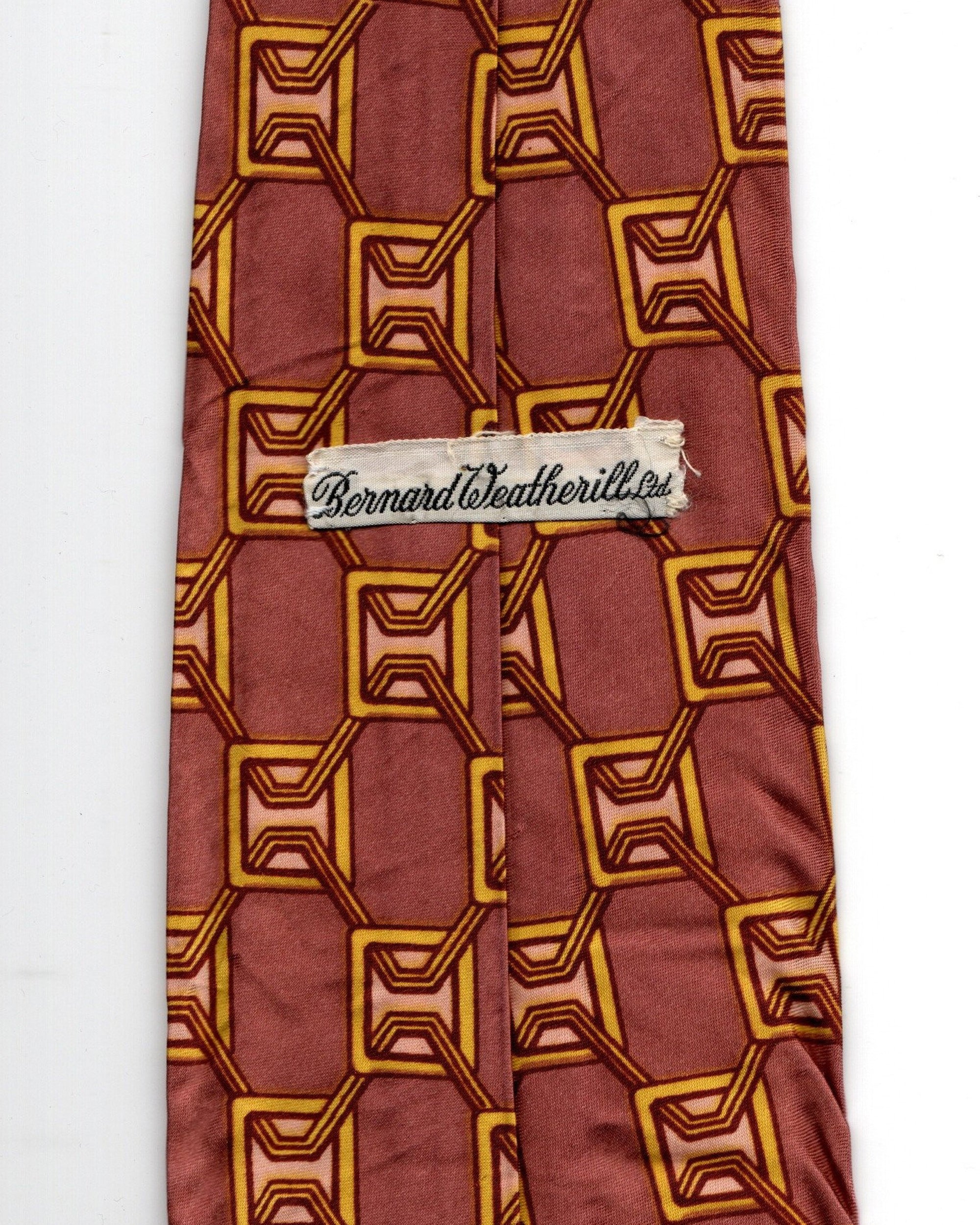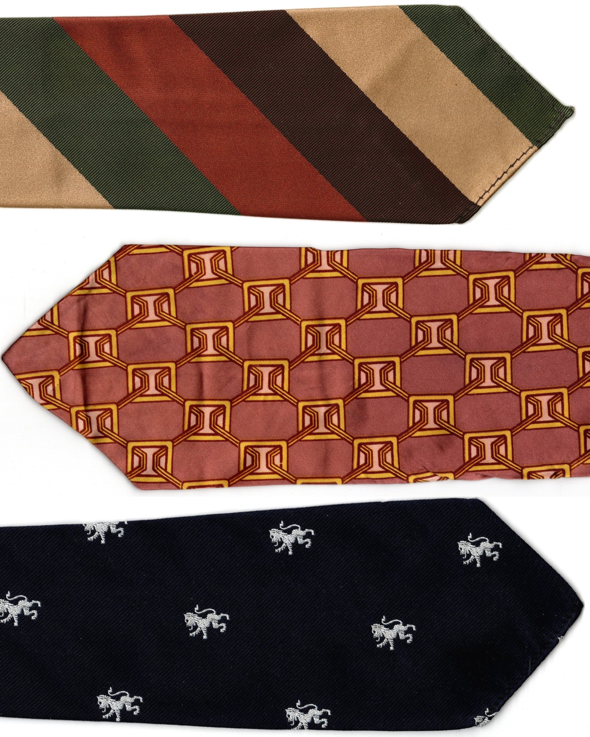Here are three vintage British ties from the 1950s1960s. This selection of ties is designed to give the buyer a selection of colours and styles. The pink/gold silk tie was made for the Bernard Weatherill Ltd, a tailors shop on London’s Savile Row, and dates from the late 1960s. The striped tie dates from the 1960s. The ‘Lion Rampant’ tie dates from the 1950s/1960s.