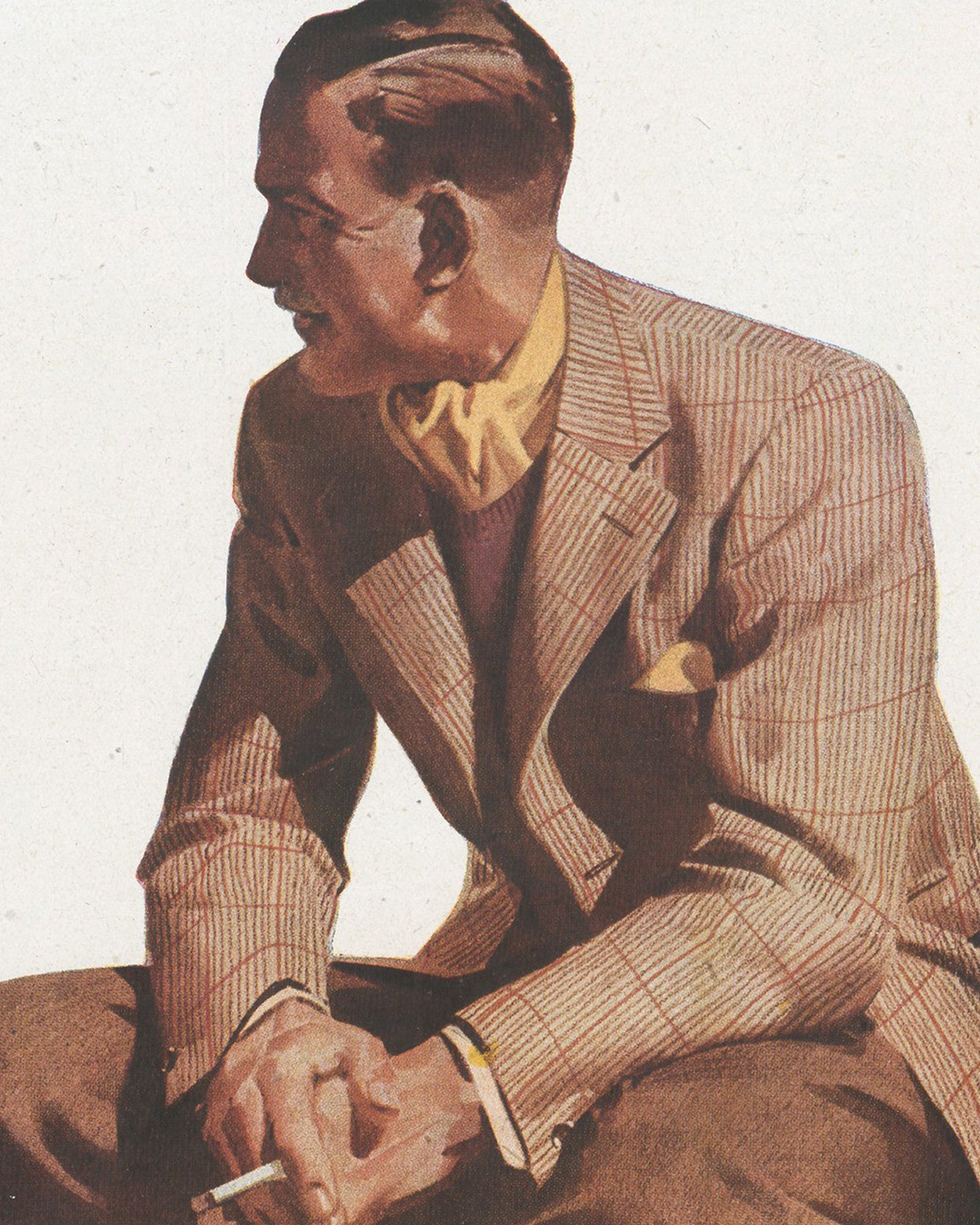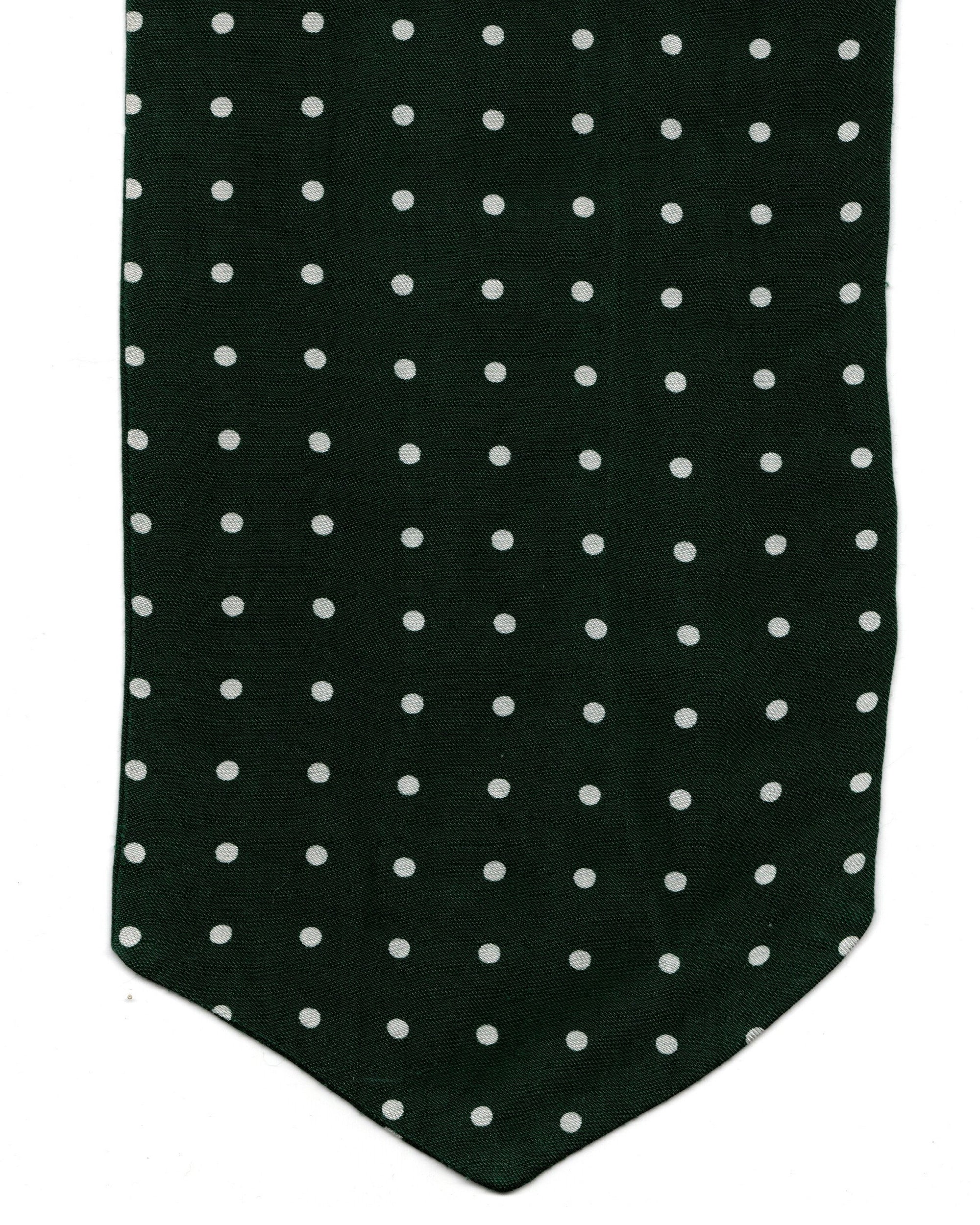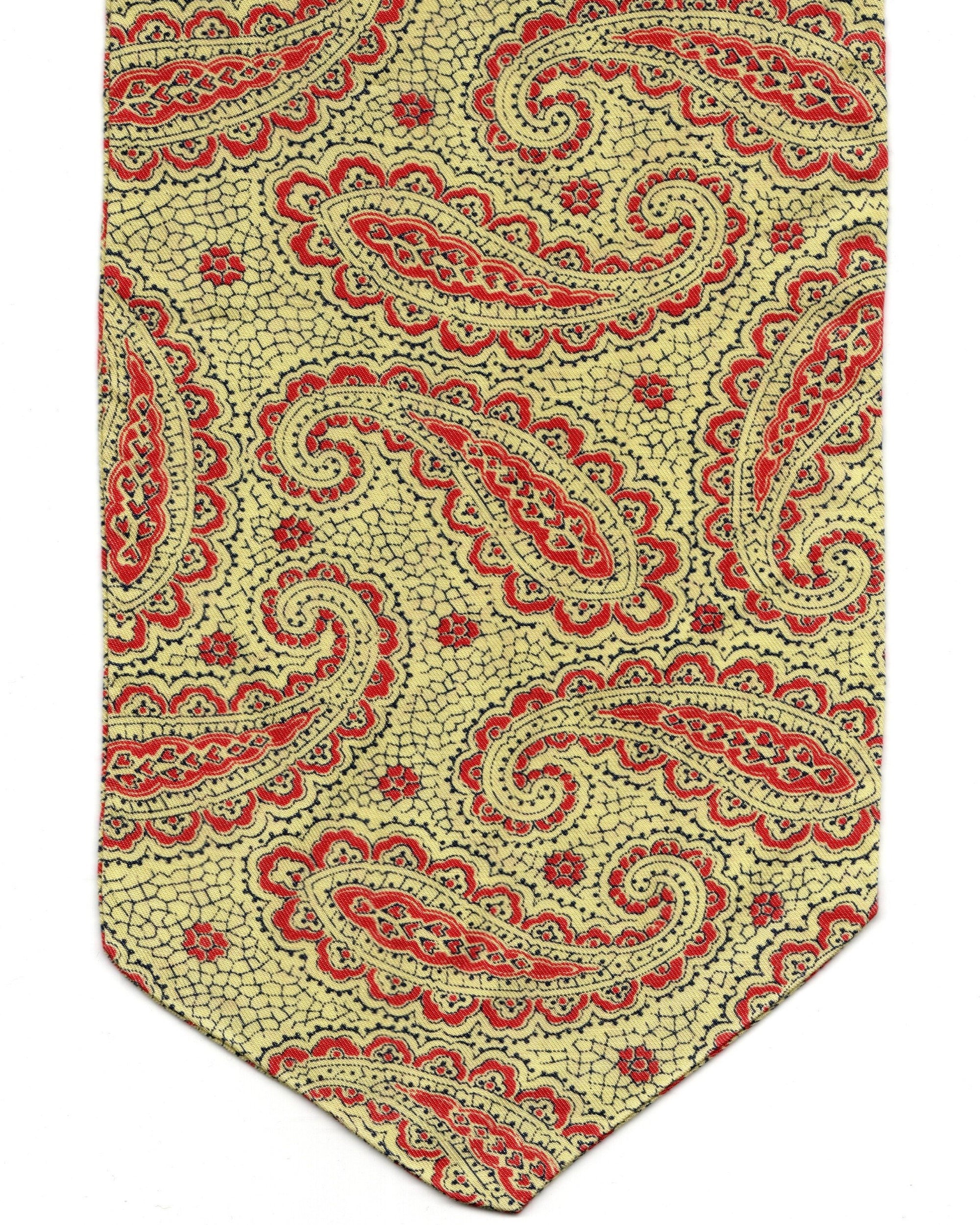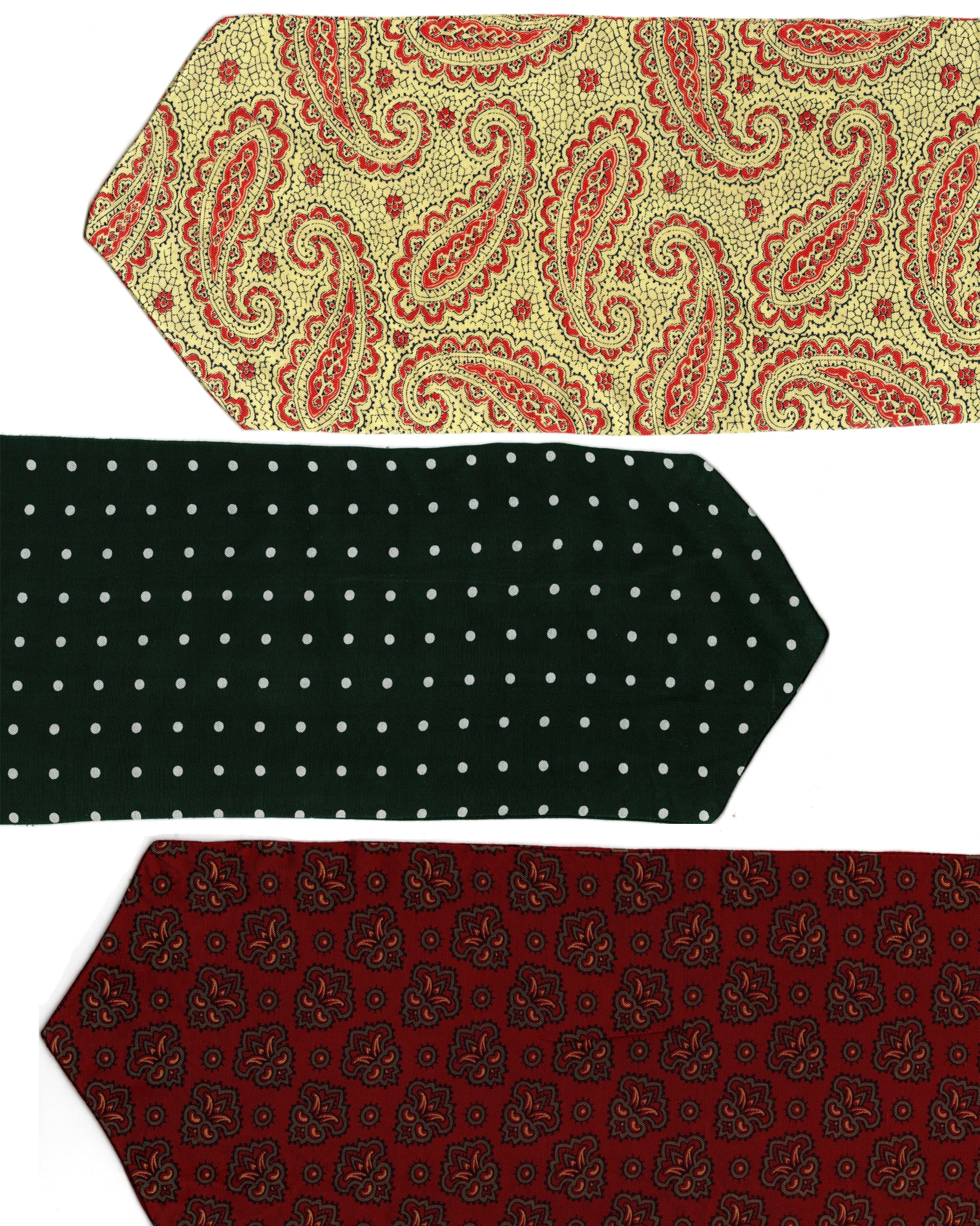 Here we have three mid-20th Century rayon cravats made by the legendary British brand Tootal. We have chosen each set to cravats to give you a selection of patterns and colours. All three cravats in this selection have the open neckband that was the original style used when Tootal starting producing cravats in the 1930s. Tootal was one of the most notable British cotton and rayon manufacturers of the 20th Century. Their prolific scientists were responsible for developing and refining crease-resistant, colour-fast cottons and luxuriously soft rayon fabrics. The results of their endeavours were fabrics which offer high-quality products to the mass market. Tootal’s fabrics were exported worldwide and their patented processes for treating fibres were used under licence to produce fine fabrics. In the menswear world, Tootal’s ties, scarves and cravats dominated the marketplace due to their ability to resist creases and the ease with which they could be washed. In addition, Tootal didn’t just rely on its fabrics but also excelled in the colours and patterns they offered. Every colour and every imaginable design were available. Paisley patterns were a favourite, in particular their ‘art deco’ inspired reinterpretations of the style. There were also polka-dots (like the green cravat here), stripes, abstract patterns, gothic swirls and solid colours. This range of colours and styles means Tootal offered a cravat for every possible outfit. The result of the variety of colours and styles is a thriving collectors market for vintage Tootal products.