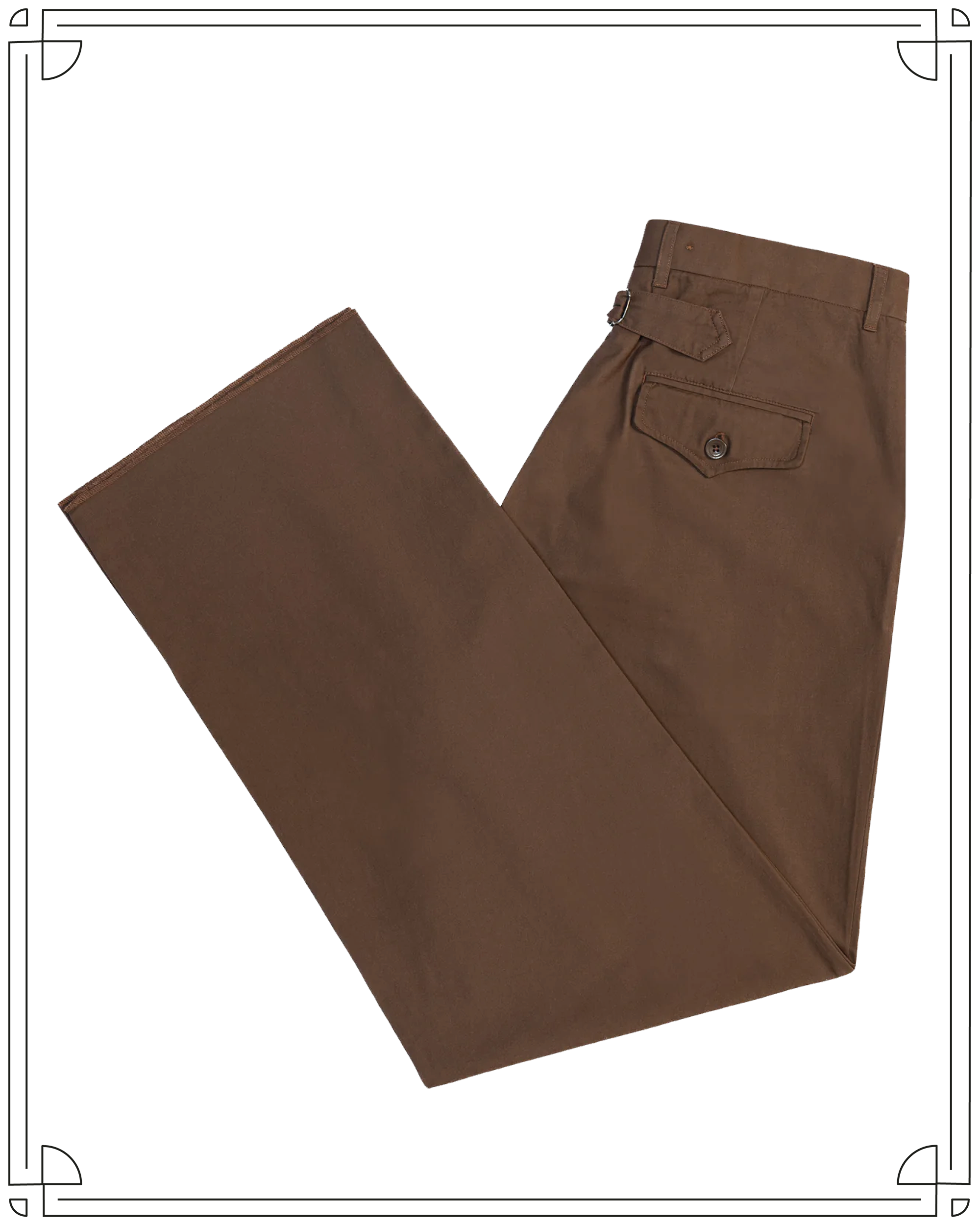 Try these flat fronted, lightweight poplin cotton work trousers (based on the o.g. Deck Pants of yore). Seen here in Chocolate, also available in Cream and Navy . These Cathcart classics feature a high rise and wide leg providing a cool classic silhouette. Cotton poplin is prized for its lightweight durability, smooth texture, and breathability, making these the ideal summer trousers crafted for daily wear in mind. Pair it with the matching Brookland Jacket (in cream), and a Deco Polo to complete the look.