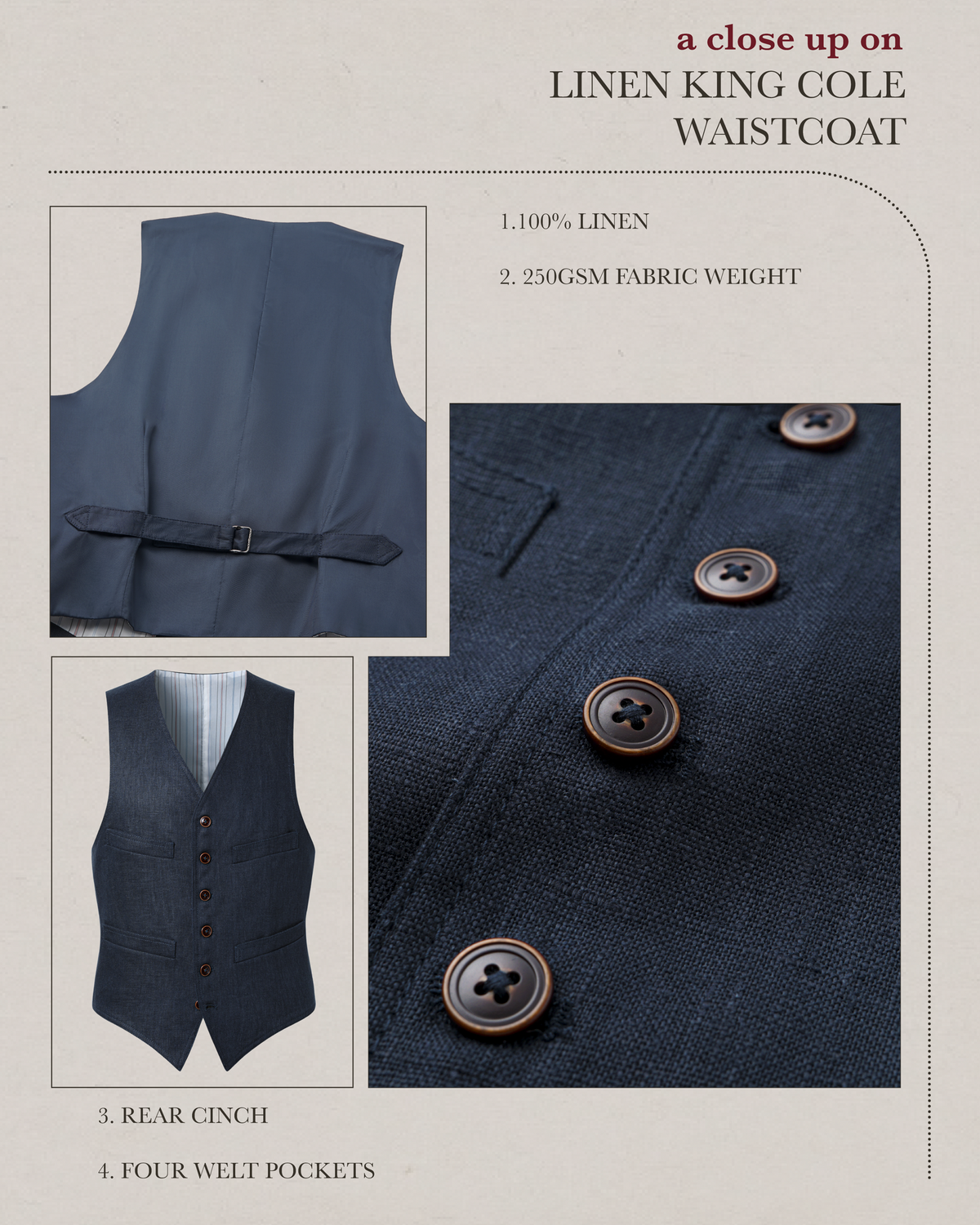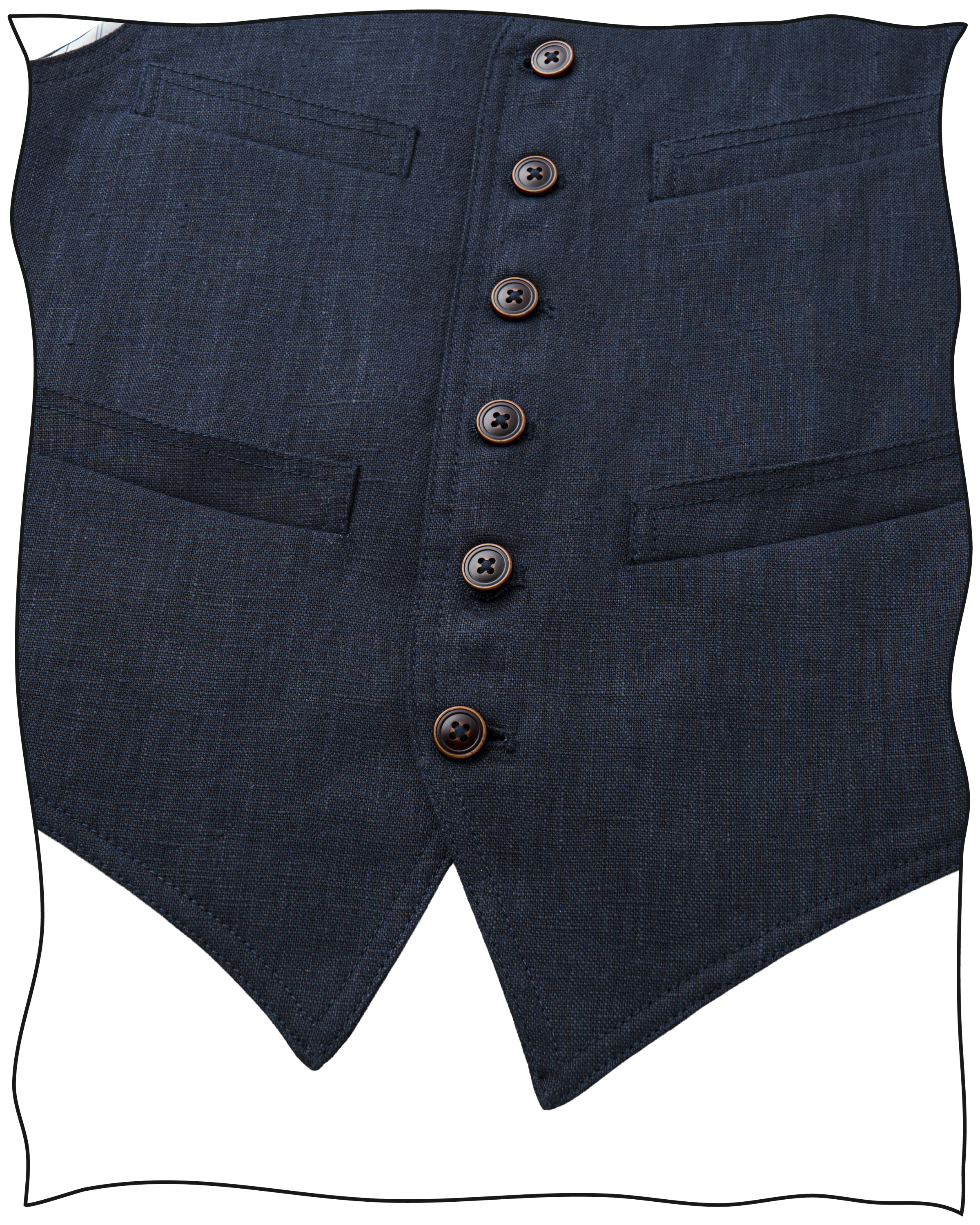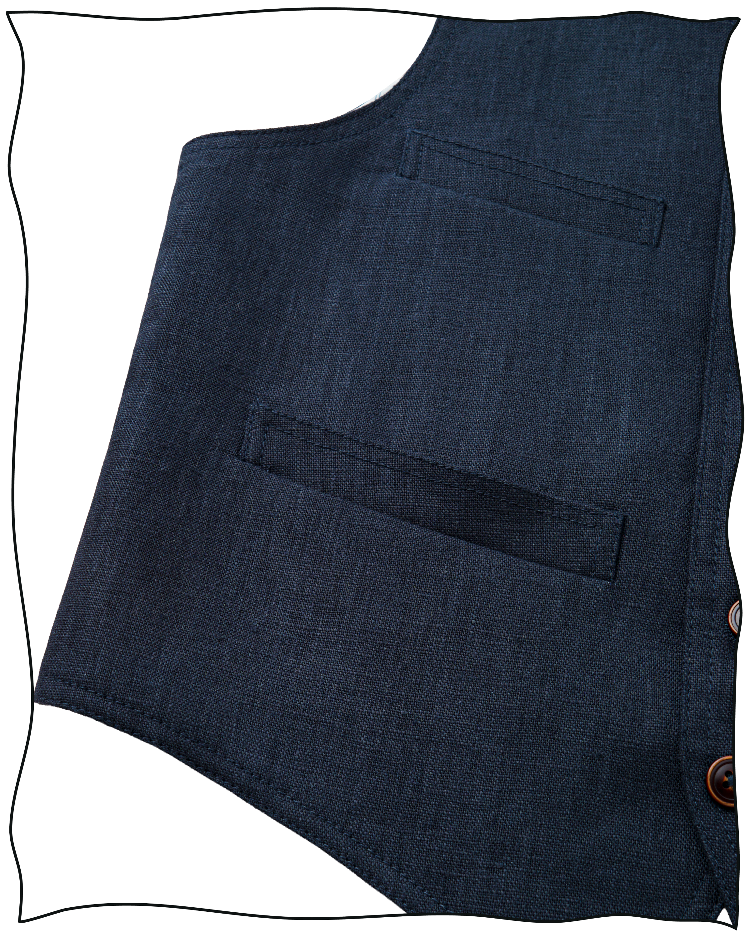 The icing on the cake of the King Cole Suit is this handsome four pocket waistcoat, arriving in the very same linen fabric.