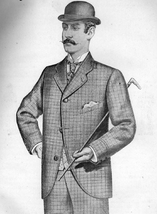In addition to ‘fancy’ tweeds – sourced from across the British Isles - that were favoured for ‘tourism suits’, the lounge suit was available in a range of fabrics including grey worsted flannel, Cheviot cloth, vicuna, ‘Angola’ wool (which was actually a type of Angora wool), serge and “finer materials suited for the promenade”. Patch pockets were reported to be favoured when making a suit from a wool check fabric. By the late 1890s narrow stripes were in fashion for lounge suits, as were brown and fawn cloths. In the early period, the suit was often made with a “coat and vest alike” combined with “trousers diverse” … that is to say, jacket and waistcoat in one cloth and trousers in a different colour or pattern. In the late 1890s it was reported that the three-piece suit all made from the same cloth, and referred to as ‘ditto’ suits, had fallen out of fashion with the upper classes due to the popularity of the style among the lower classes.