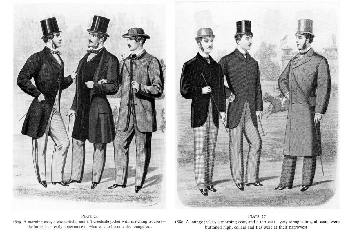 Right: This shows the comparison between the lounge suit and more conventional outfits. The lack of a waist seam marks the lounge suit as distinct from its competitors.(1880)