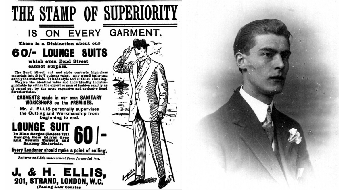 Left: An advertisement showing the lower button position of 20th Century suits (Army and Navy Gazette - 1911)