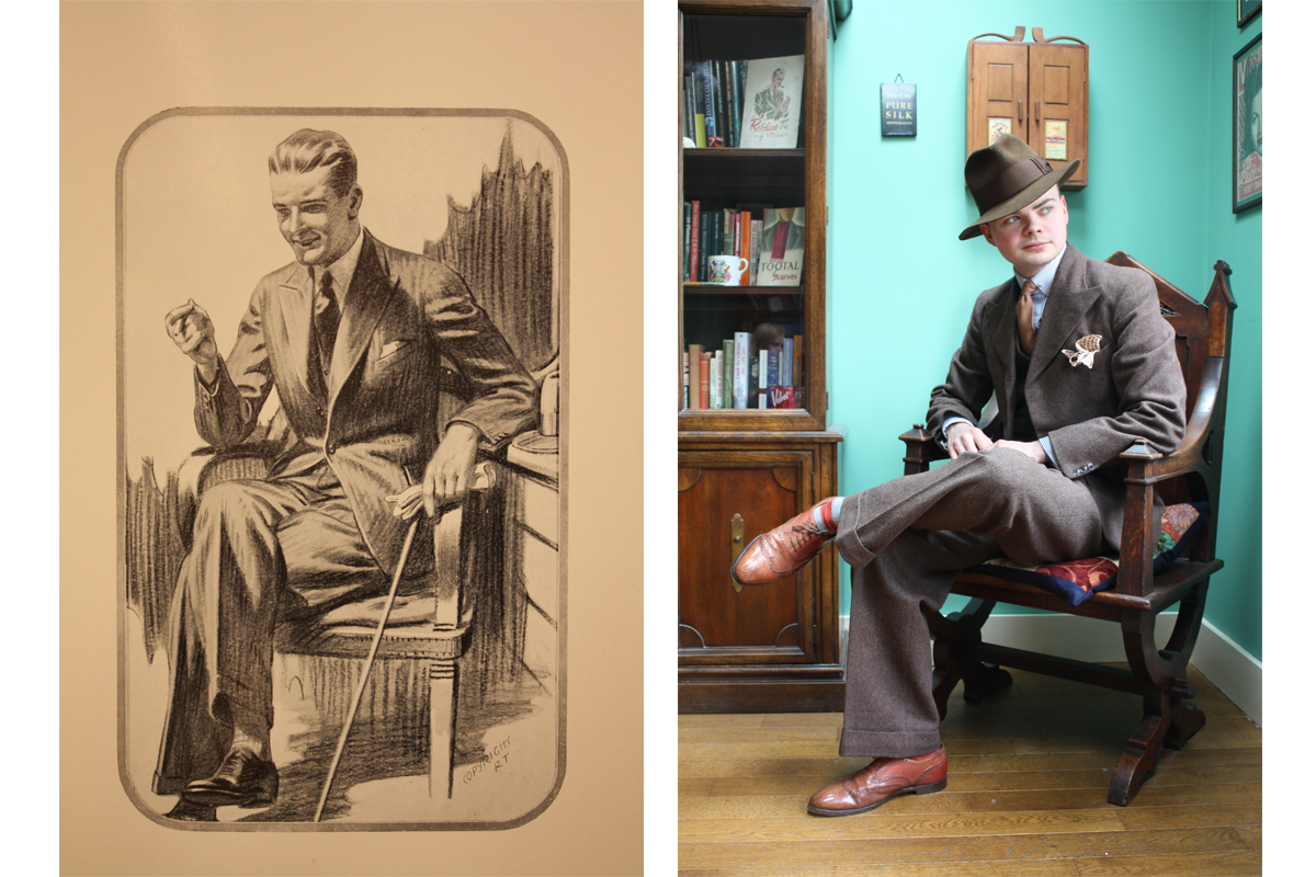 Lounge suit from The Sartorial Gazette (1930) and an original tweed lounge suit, modelled by Savile Row tailor Alex Hills.