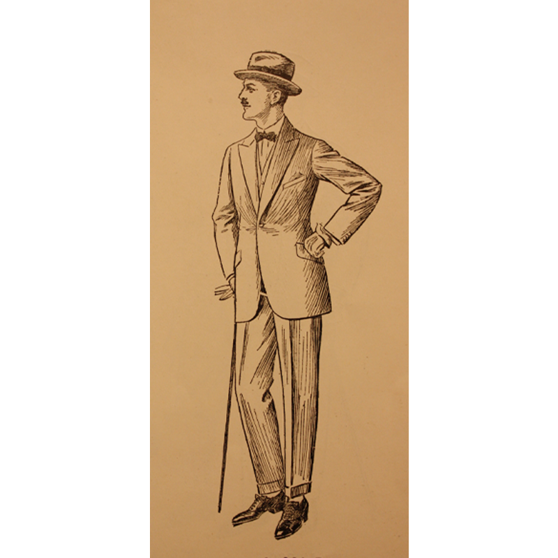 In 1909 a journalist from Tailor & Cutter made a survey of men in one carriage of a London Underground train. The men were described as middle-class: “They are surveyors, councillors accountants and tradesmen of various sorts … and what are they wearing?” The answer was as follows: “It is hardly necessary for us to state that they overwhelming majority are wearing lounge suits; for in nearly every crowd of Englishmen the lounge suit is the wear of quite three-fourths of them, and this crowd is no exception.” Out of 21 men, 15 were wearing lounge suits, with just one man out of the 21 wearing a waistcoat with lapels and one man wearing trousers with turn-ups. A majority of the lounge suits had a back seam which opened into a single vent and had just two exterior pockets, on the hip. A majority of the waistcoats were made from the same cloth as the rest of the suit. The report also noted an increasing number of the lounge suits having a lower button stance than in earlier years, with some being fastened on the waist.  The suits were predominantly made from plain tweeds or worsteds. The rest of the descriptions give a good idea of the styles of the period: Twelve were wearing straw boaters, 6 were wearing black felt bowler hats, one was wearing a top-hat and one was wearing a flat cap. The majority of the men were wearing soft-collared shirts.