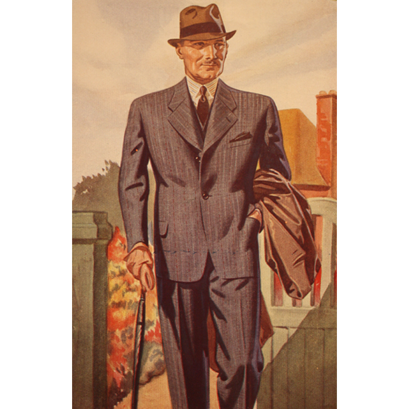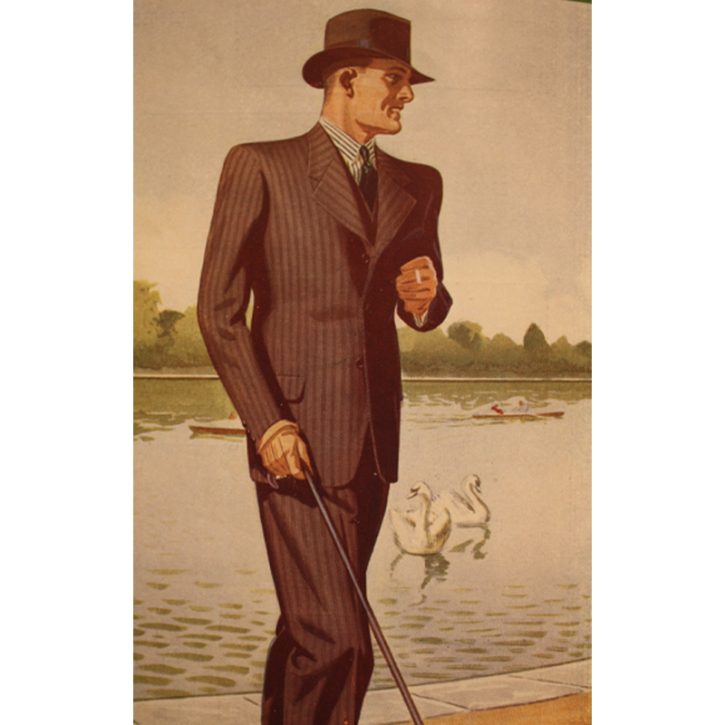 What the Victorians had seen as a daring challenge to formality had become the accepted manner of dress. First the frock coat was consigned to history, then the morning coat slowly began to disappear, its role being reduced just for some weddings and for a handful of formal events – the type of events very few people ever attended. Increasingly, men who wore suits for work wore what the tailoring trade called a lounge suit. They became the standard outfit for men of all classes of society, with the middle-classes having a suit for the office and maybe one for ‘best’, perhaps even an old one they could wear around the house. Working class men might wear an old lounge suit for work, accepting that it would deteriorate with the rigours of labour, but still giving them a certain level of formality, then own a ‘Sunday suit’ that was kept, in the parlance for the day, for ‘best’. Slowly but surely, the lounge suit had become the dominant garment in the world of suiting. Even ‘black lounge’, consisting of a black jacket and matching waistcoat worn with striped trousers, which had become the ‘uniform’ of the bankers of the City of London, a look which resisted the passing of time for so many years, eventually gave way and had all-but died out by the 1980s. Although tailoring journals continued to refer to the lounge suit, for the average man it was simply a suit.