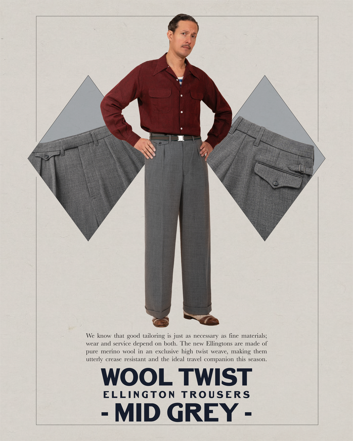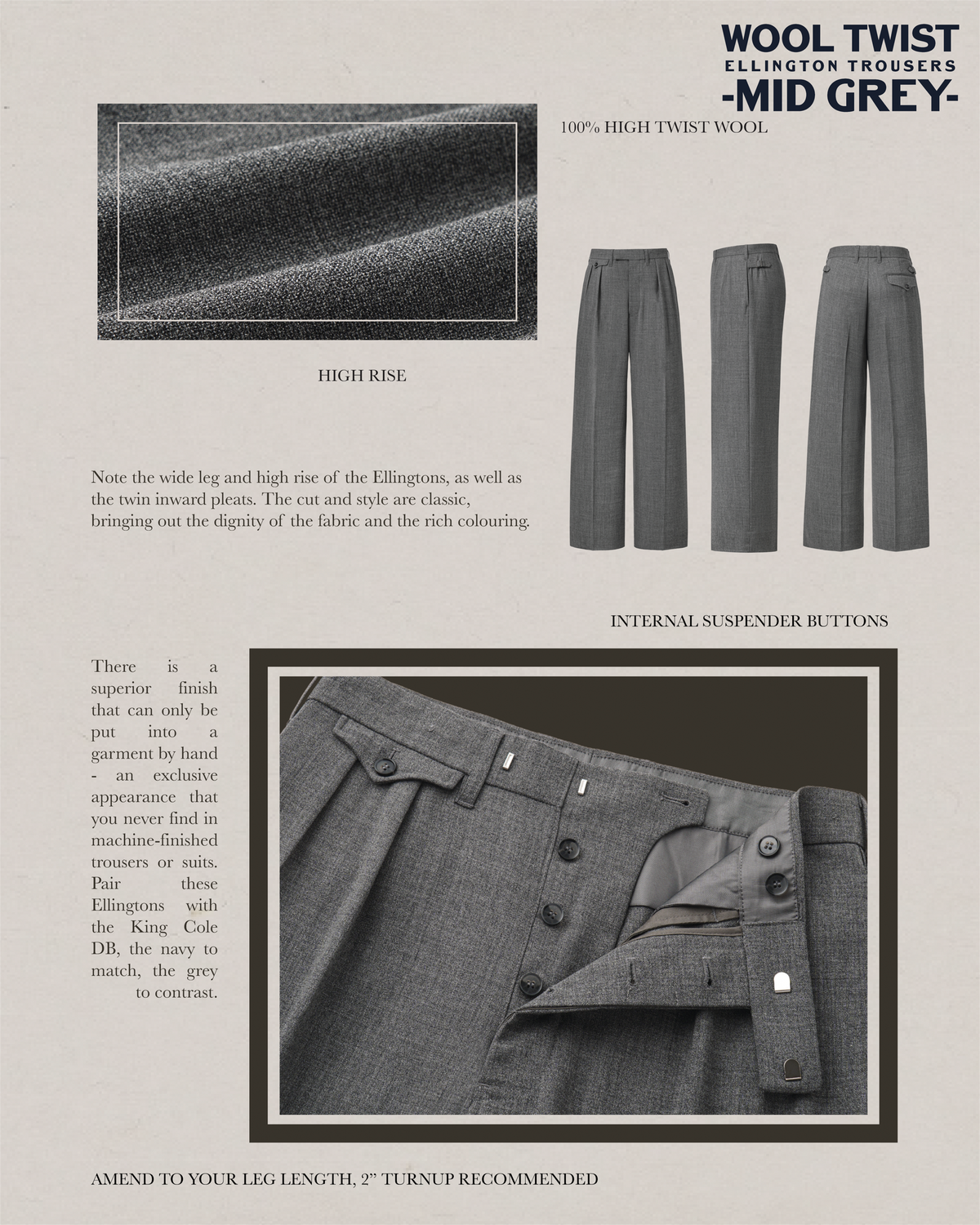 We know that good tailoring is just as necessary as fine materials; wear and service depend on both. The new Ellingtons are made of exceptionally fine pure merino wool in an exclusive high twist weave, making these trousers totally crease resistant and the ideal travel choice this season. Note the wide leg and high rise of the Ellingtons, as well as the twin inward pleats. The cut and style are classic, bringing out the dignity of the fabric and the rich colouring. There is a superior finish that can only be put into a garment by hand- an exclusive appearance that you never find in machine-finished trousers or suits. Pair these Ellingtons with the King Cole DB, the navy to match, the grey to contrast.