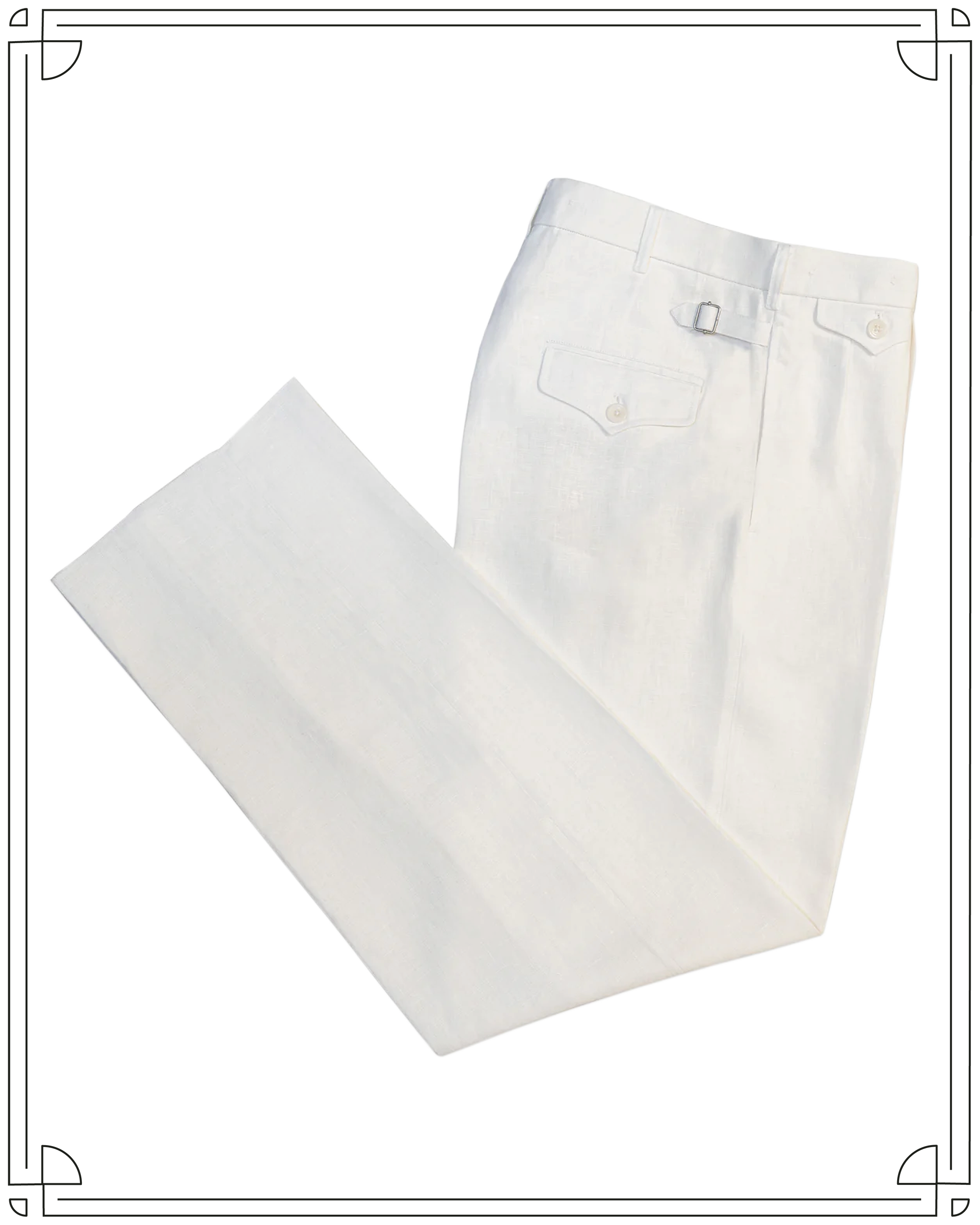 The all-time bestselling trousers from Cathcart enter the ring once more, now arriving in pure linen. With its characteristic wide leg and high rise, these are the go-to summer trousers for all occasions, blending seamlessly into tailored and casual looks alike. Pair this British classic with the new Gable Jacket (cut in the same linen) to complete the suit or with a Deco Polo for a more relaxed summer look. Smashing.