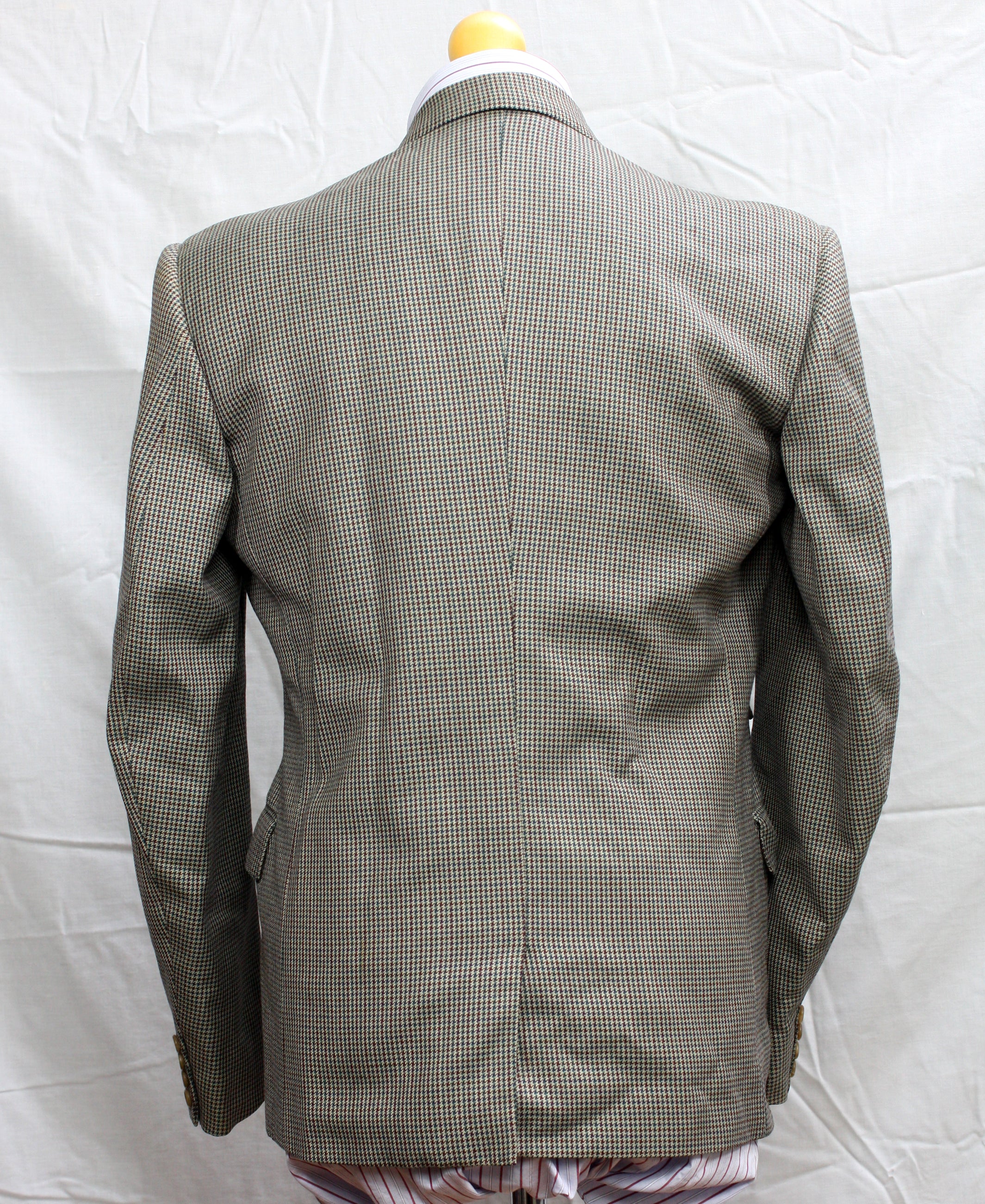 This is a vintage sports jacket made by the legendary British menswear company, Burtons in 1963. It is made from a subtle three colour ‘puppy-tooth’ wool cloth. The two-button front, with hacking jacket style pockets and a single rear vent, is a style that was popular throughout the 1950s and into the early sixties.